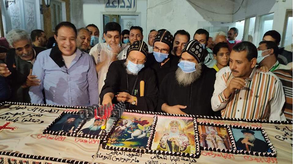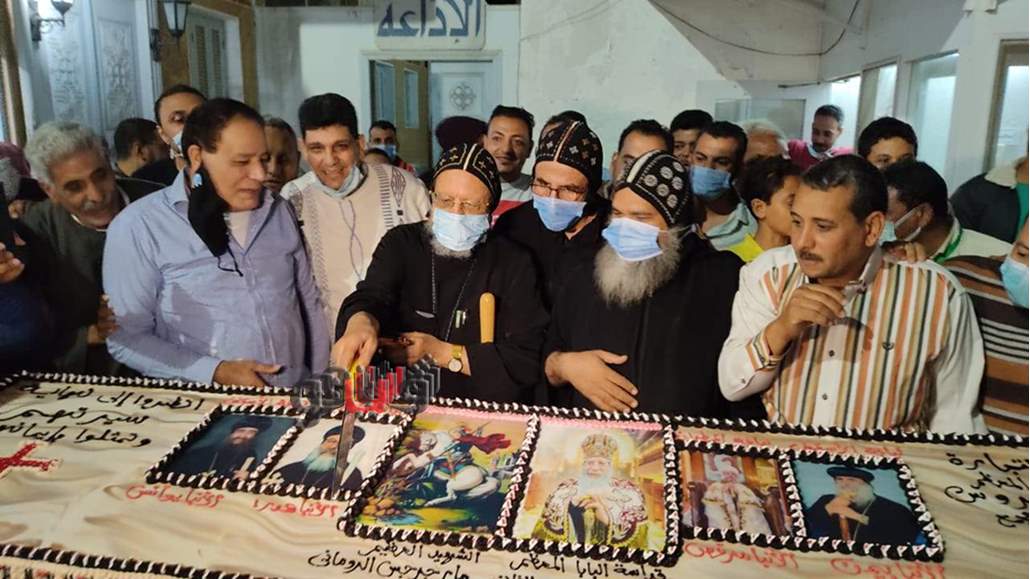 والتف العديد من الاباء الكهنة وابناء الايبارشية والمحتفلين حول التورته التي كانت تتزين بصور البابا شنودة الثالث والقديس العظيم مارجرجس والبابا تواضروس الثاني ،وصور أعضاء اللجنة البابوية المشرفة على أحتفالات الدير، الأنبا هدرا مطران أسوان، الأنبا مرقس مطران شبرا الخيمة والنائب البابوي للدير، الأنبا بيمن أسقف نقادة وقوص ، الأنبا يؤانس أسقف أسيوط.