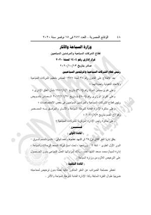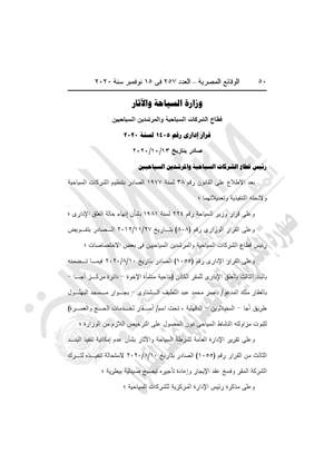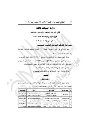 - 3 قرارات وزارة السياحة والآثار، القرار رقم 1404 لسنة 2020، بالغلق افداري لشركة "المسعد للرحلات السياحية" ببورسعيد.