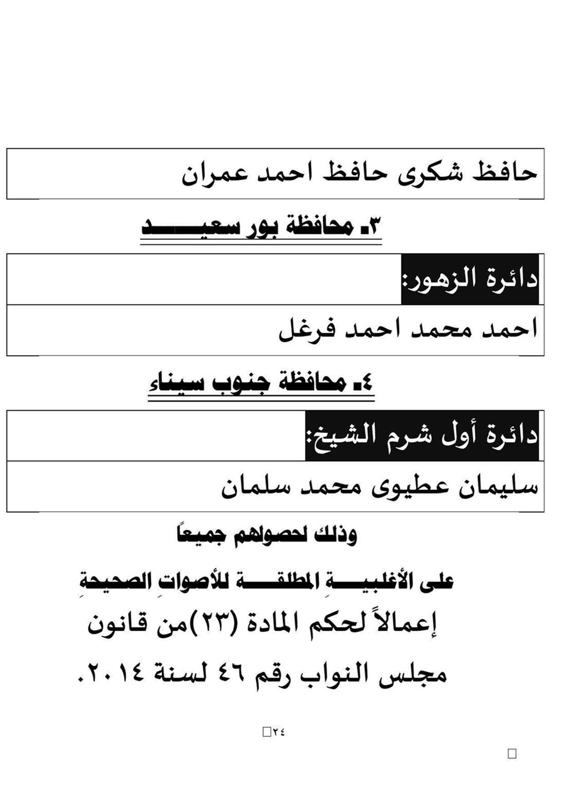 أعلن المستشار لاشين إبراهيم، نائب رئيس محكمة النقض ورئيس الهيئة الوطنية للانتخابات أسماء الفائزين في المرحلة الثانية من انتخابات النواب 2020 ، والتي جاءت كالآتي: