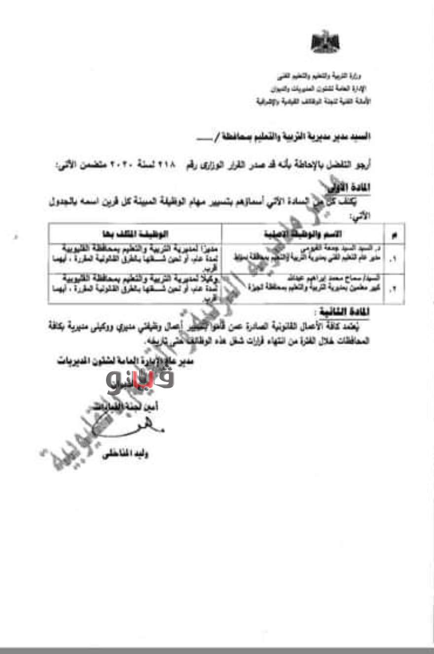 كما تم تكليف سماح محمد إبراهيم عبد الله كبير معلمين بمديرية التربية والتعليم بمحافظة الجيزة بمنصب وكيل مديرية التربية والتعليم بمحافظة القليوبية لمدة عام أو لحين شغلها بالطرق القانونية المقررة ايهما أقرب.