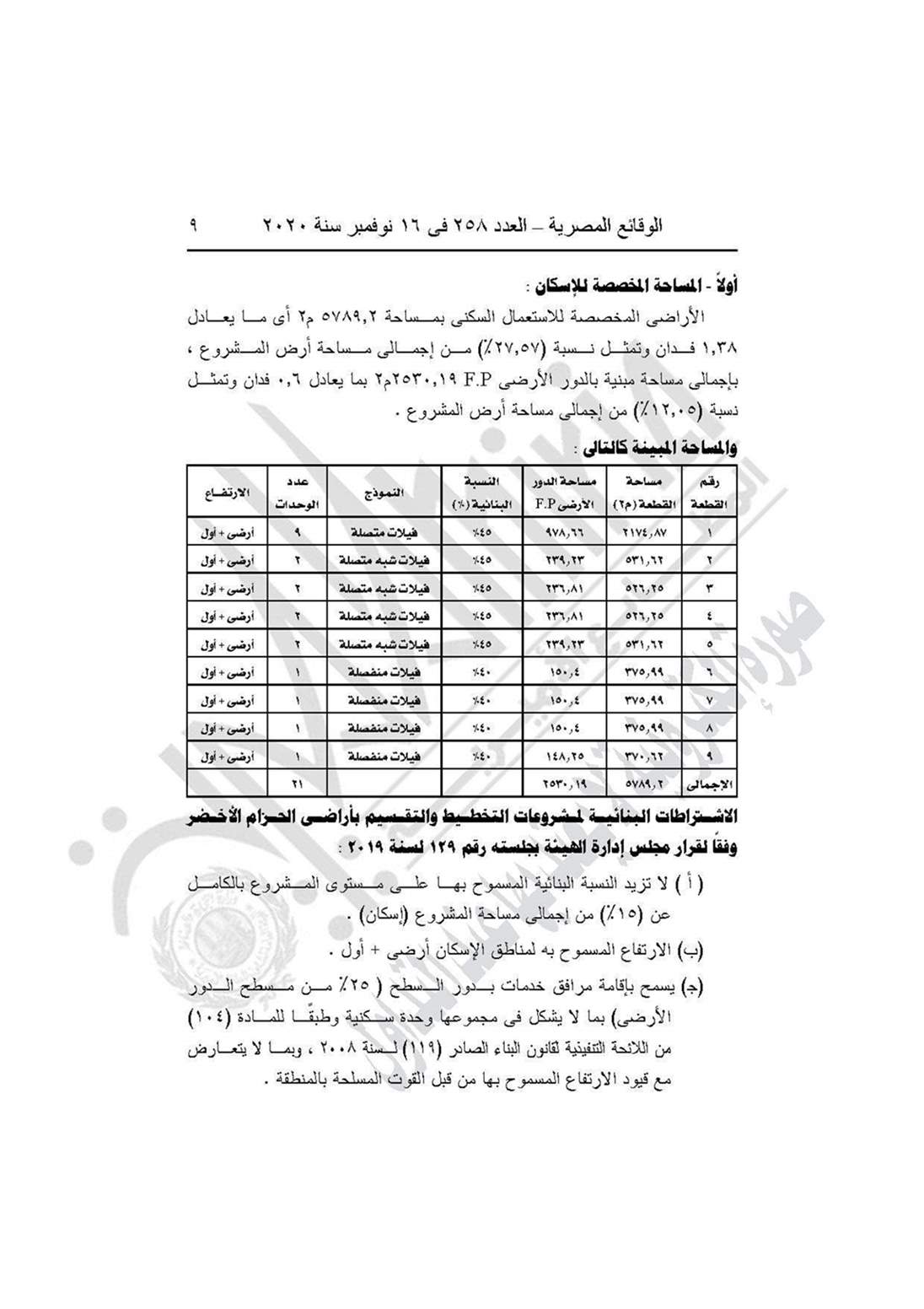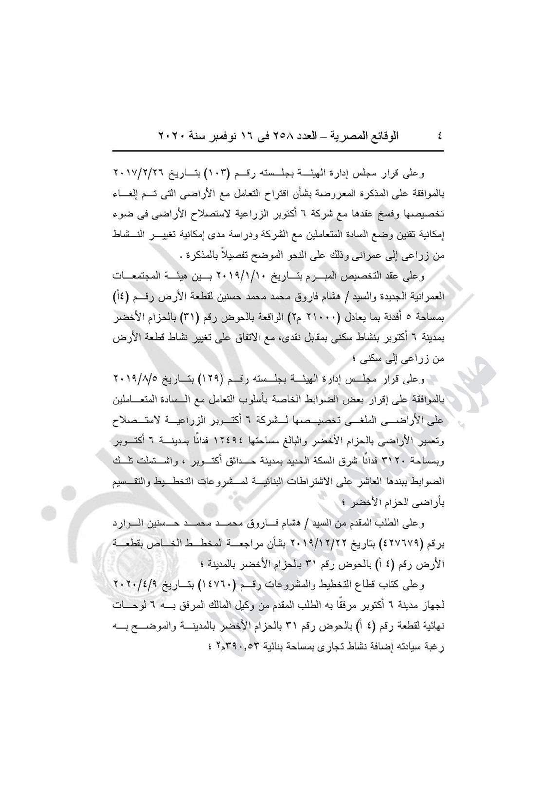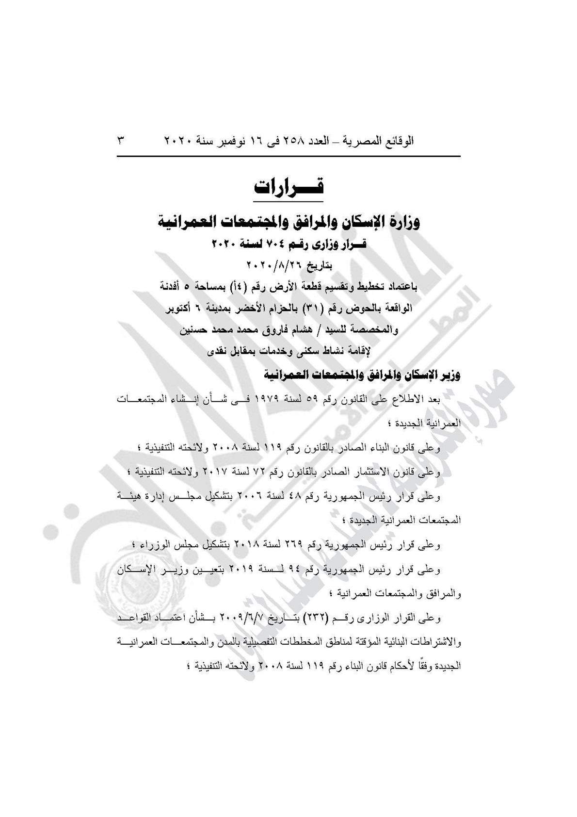 نشرت جريدة الوقائع المصرية في عددها رقم 258، الصادر في 16 نوفمبر 2020، قرار وزارة الإسكان والمرافق والمجتمعات العمرانية رقم 704 لسنة 2020، بشأن اعتماد تخطيط وتقسيم قطعة أرض بمساحة 5 أفدنة بالحزام الأخضر بمدينة 6 أكتوبر لإقامة نشاط سكني وخدمات بمقابل نقدي.