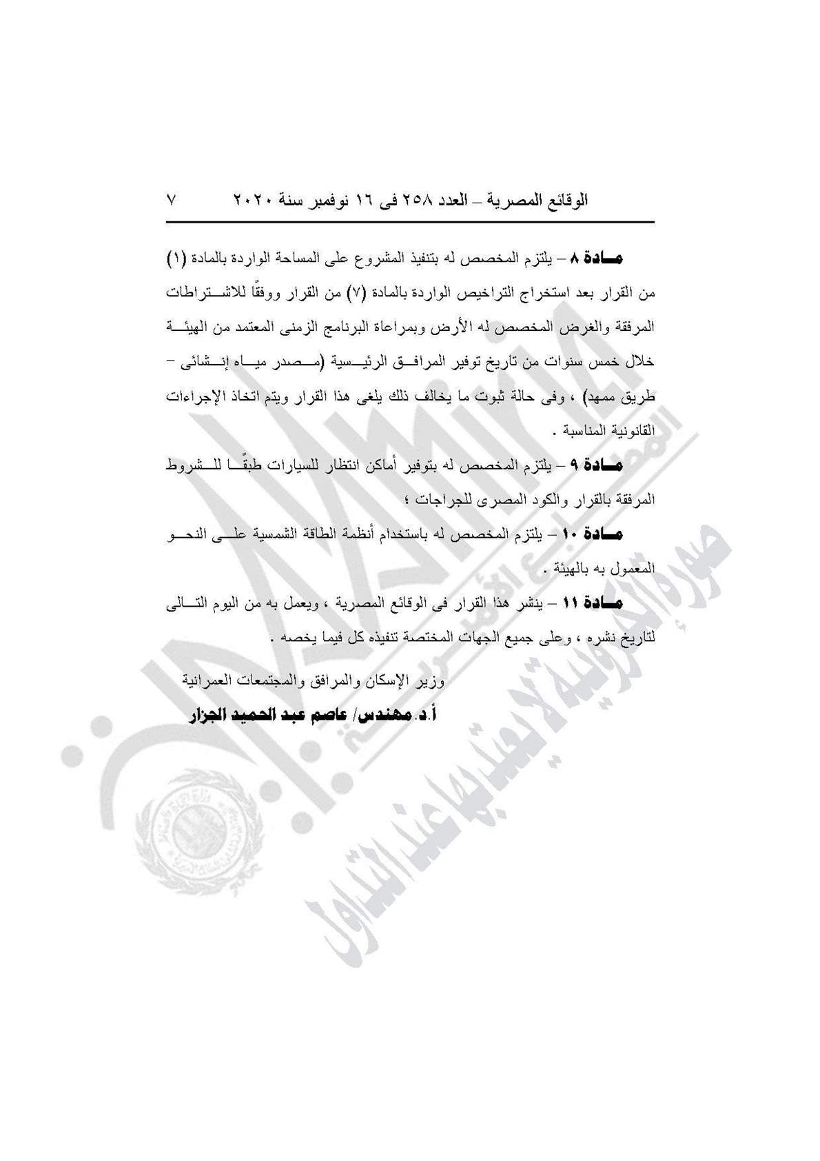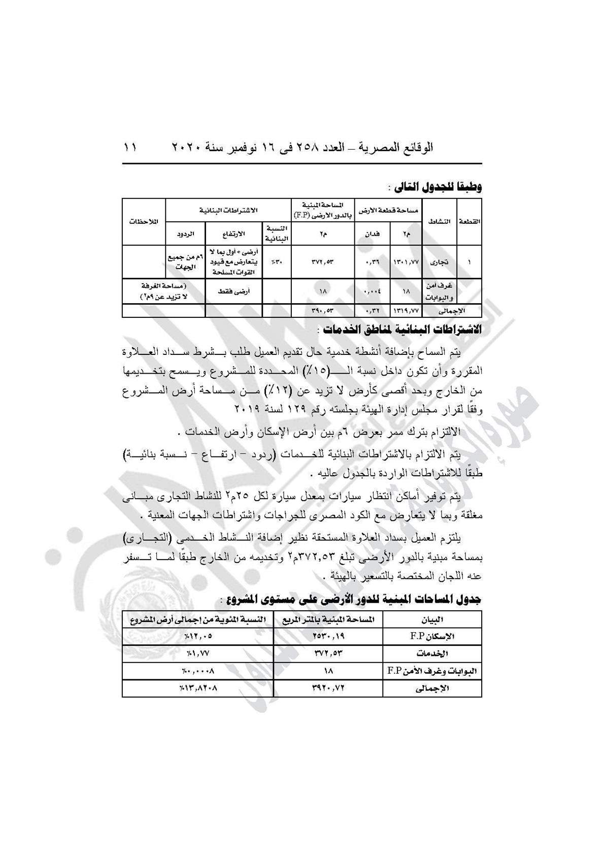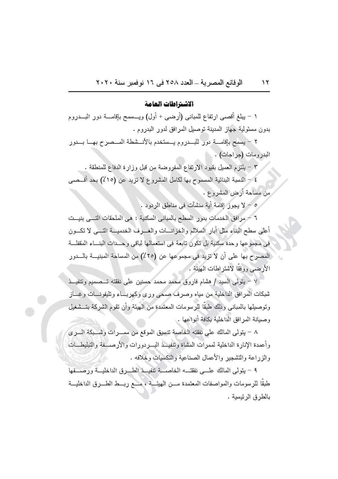 نشرت جريدة الوقائع المصرية في عددها رقم 258، الصادر في 16 نوفمبر 2020، قرار وزارة الإسكان والمرافق والمجتمعات العمرانية رقم 704 لسنة 2020، بشأن اعتماد تخطيط وتقسيم قطعة أرض بمساحة 5 أفدنة بالحزام الأخضر بمدينة 6 أكتوبر لإقامة نشاط سكني وخدمات بمقابل نقدي.