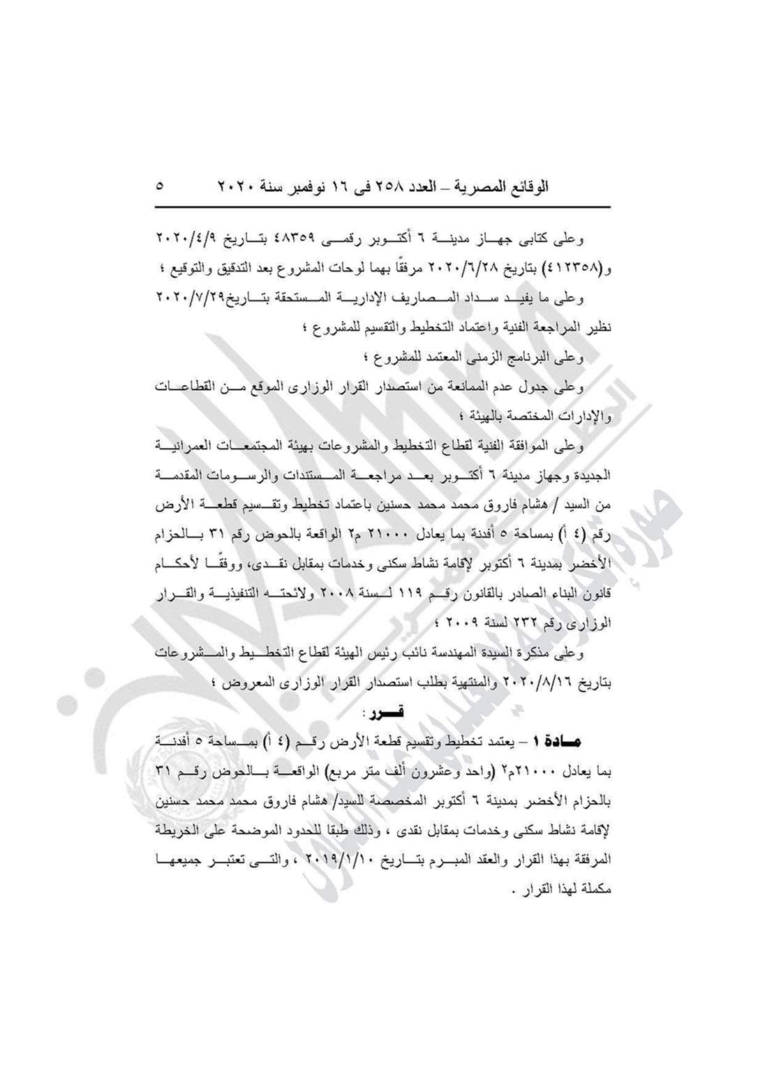 وينص القرار على اعتماد تخطيط وتقسيم قطعة الأرض رقم (4أ) بمساحة 5 أفدنة الواقعة بالحوض رقم 31 بالحزام الأخضر بمدينة 6 أكتوبر والمخصصة لهشام فاروق محمد حسنين لإقامة نشاط سكني وخدمات بمقابل نقدي.