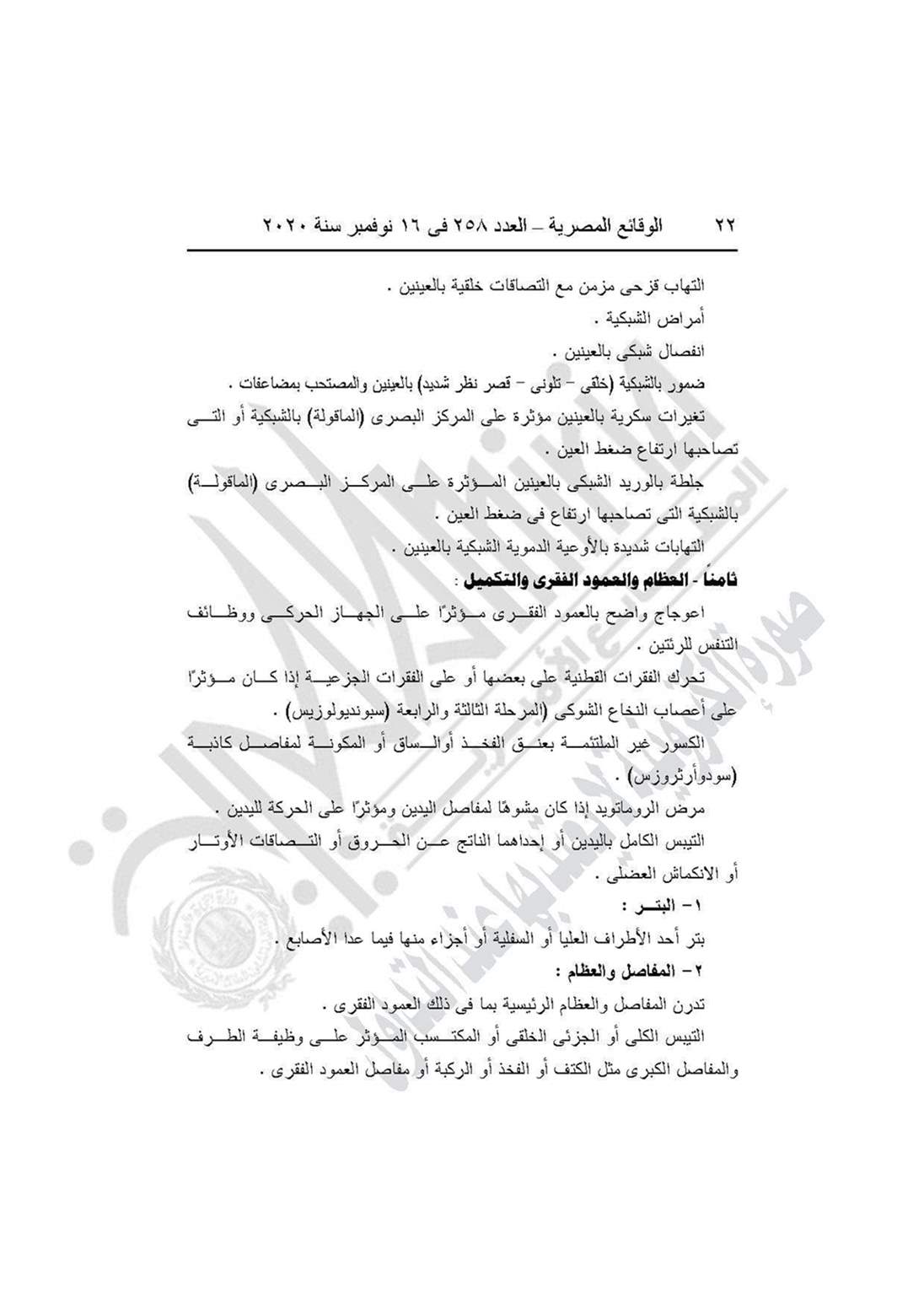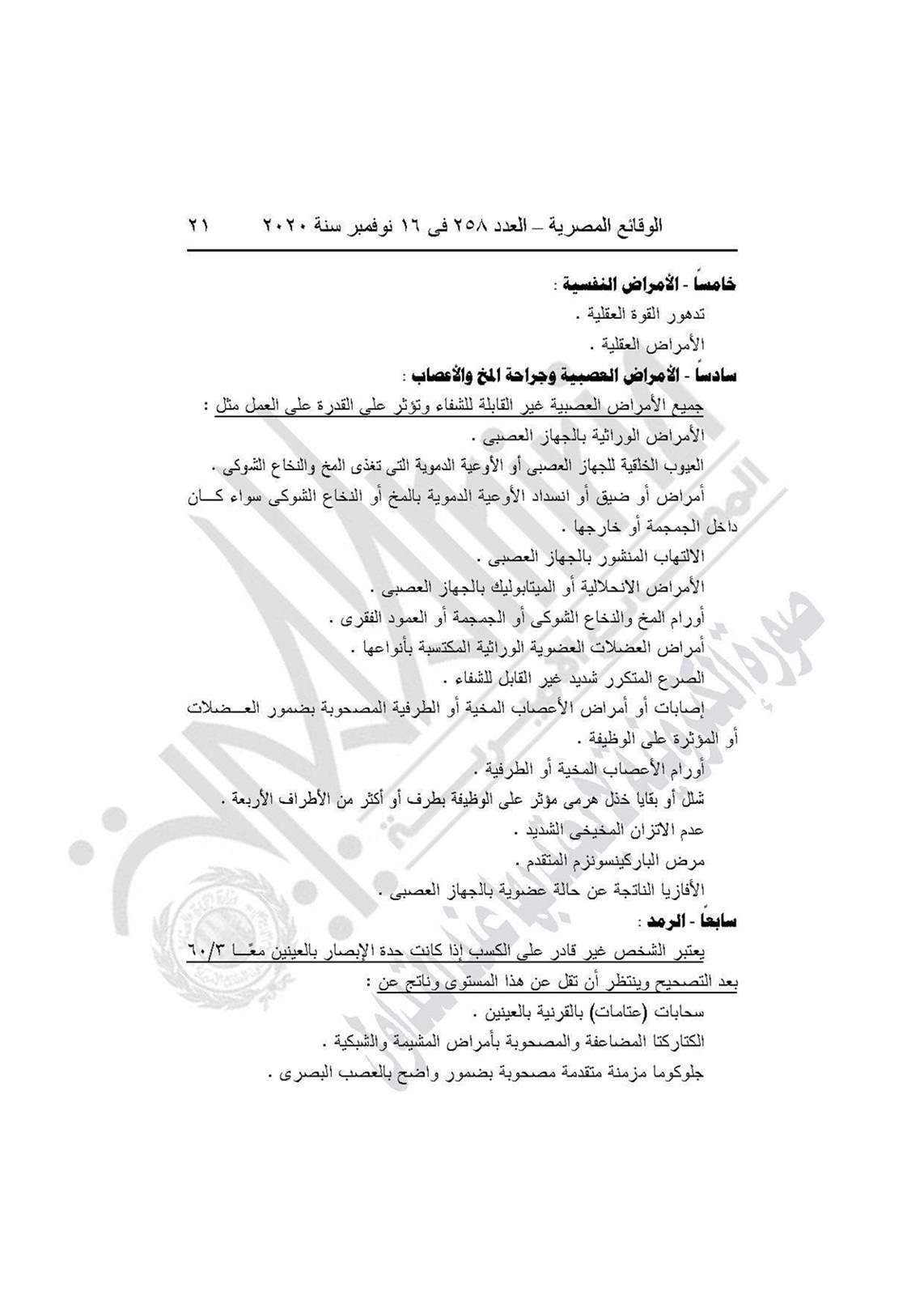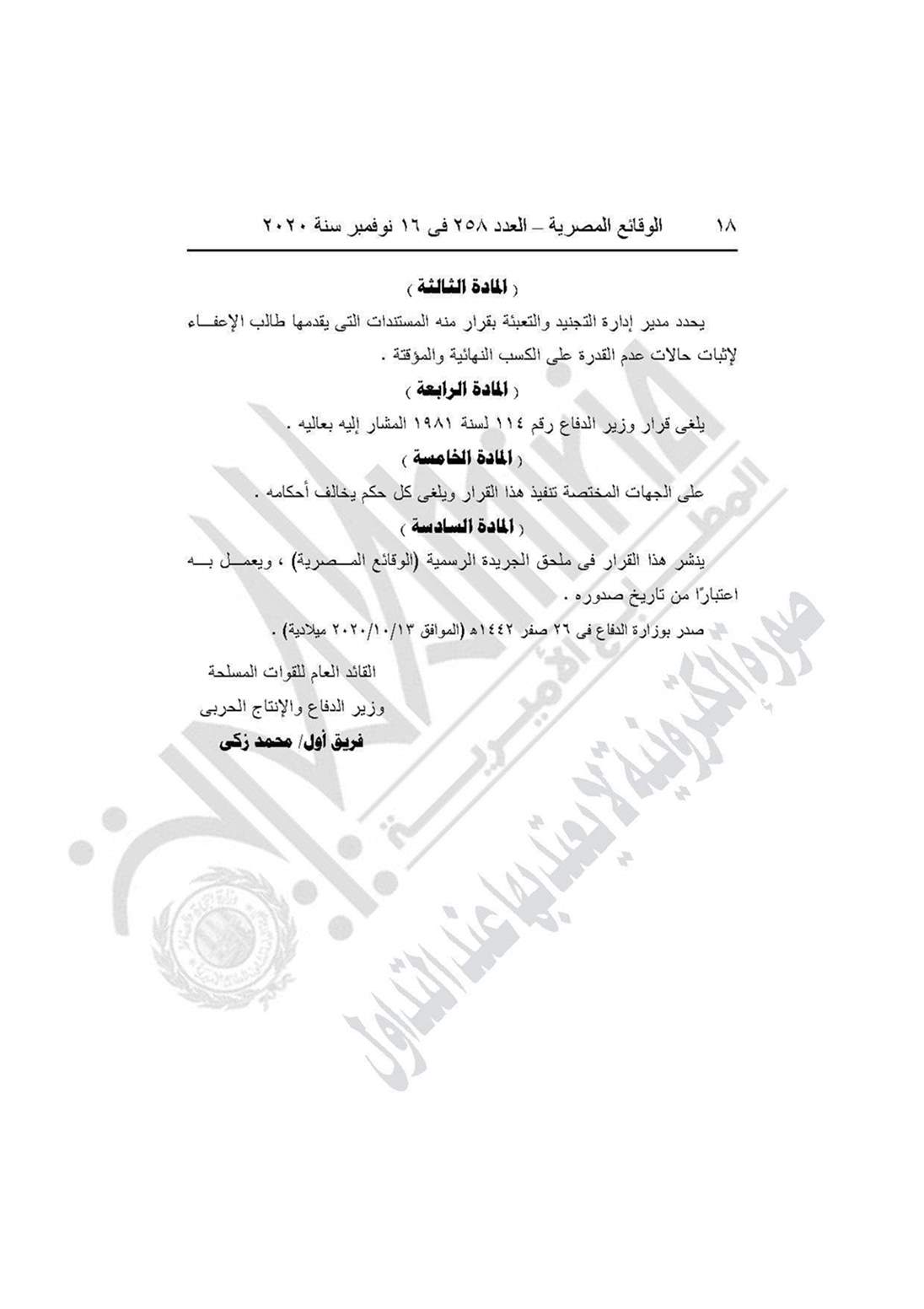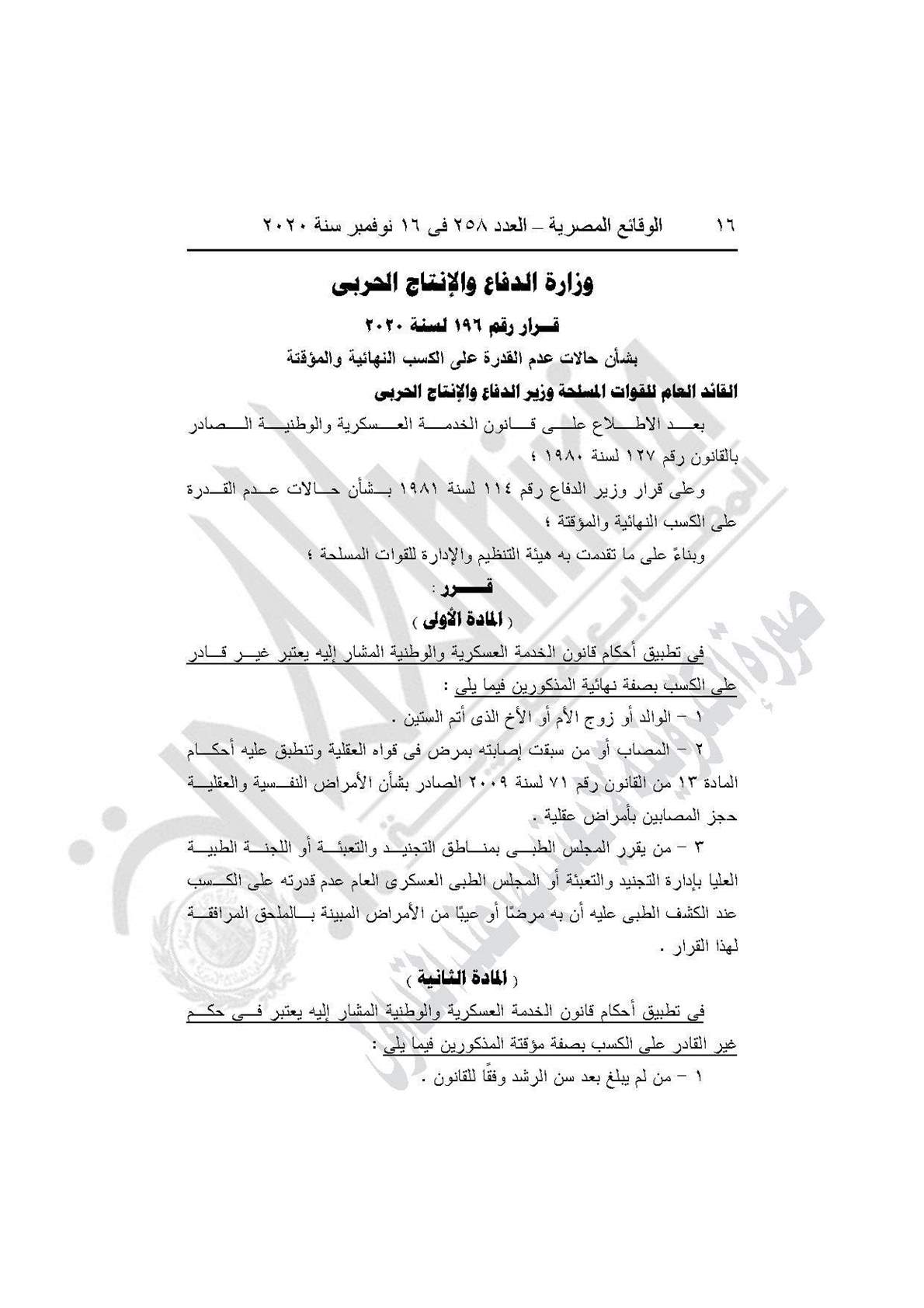 نشرت جريدة الوقائع المصرية في عددها رقم 258، الصادر في 16 نوفمبر 2020، قرار وزارة الدفاع والإنتاج الحربي رقم 196 لسنة 2020، بشأن حالات عدم القدرة على الكسب النهائي والمؤقت.