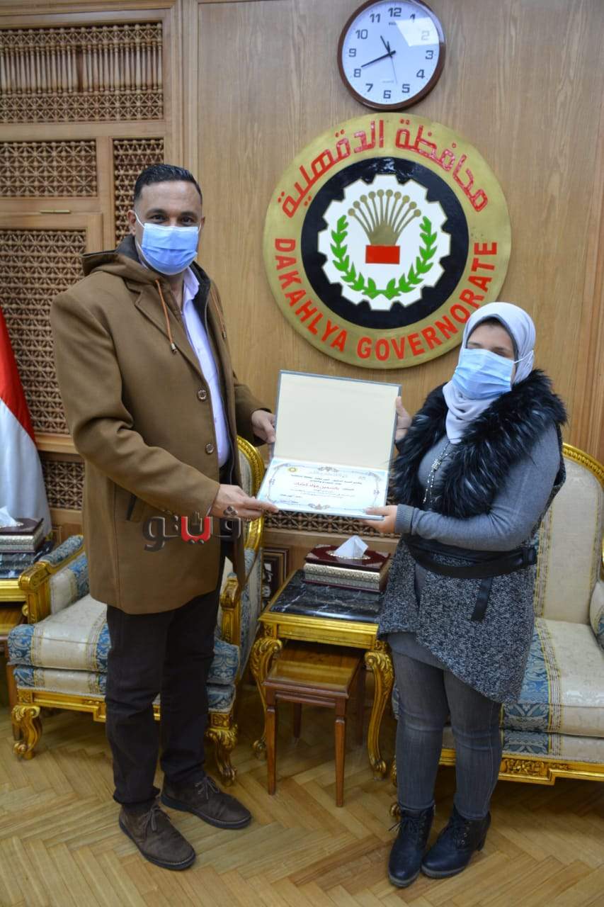 ورحب محافظ الدقهلية بالفتاة مؤكدا نها نموذج للارادة والتحدى رغم ظروفها واشار الى ان هذه النماذج ترعاها الدولة وتقدم لهم كل الرعاية والمساندة تنفيذا لتوجيهات رئيس الجمهورية، وتقديرا وامتنانا بالفتاة سلمها محافظ الدقهلية شهادة شكر وتقدير تحفيزا وتشجيعا لها ولتكون نموذجا يحتذي به أقرانها من ذوى الهمم.