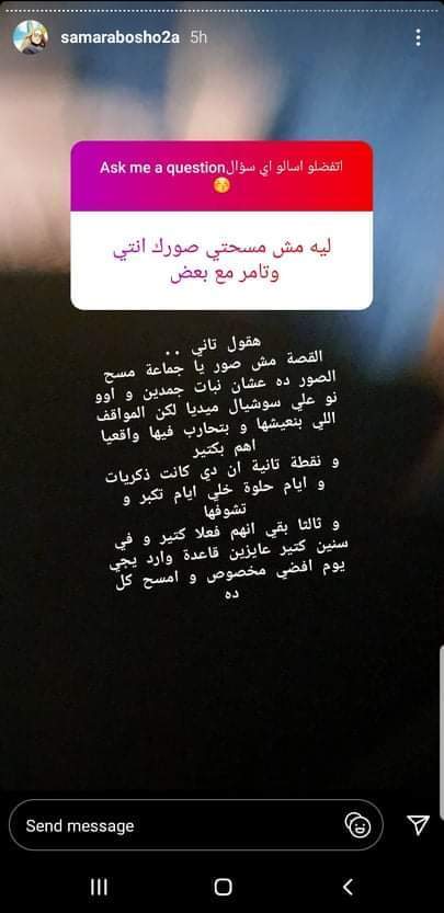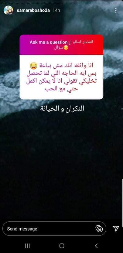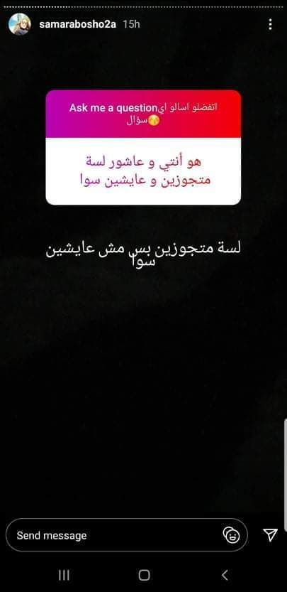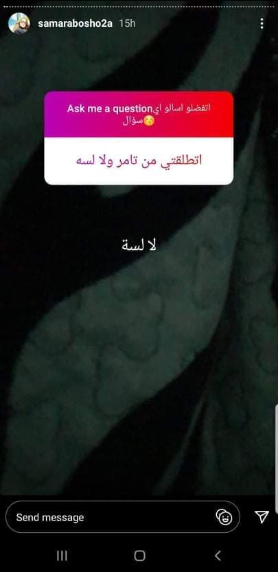 خرجت سمر أبو شقة زوجة الفنان تامر عاشور عن صمتها، إذ إنها نشرت ستورى عبر موقع الصور "انستجرام" وطلبت من متابعيها أن يسألوها عن أى شىء وستقوم بالرد عليهم.