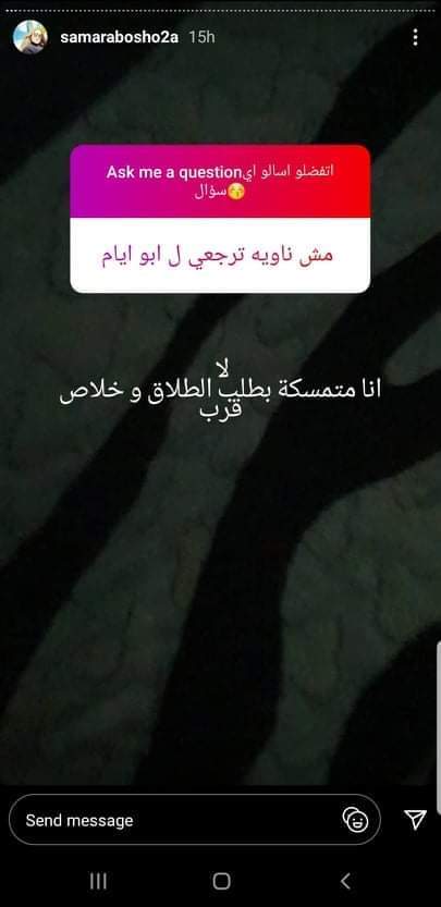 وأكدت سمر أنها متمسكة بالطلاق، ومن المستحيل أن تعود للعيش معه مرة أخرى، لافتة إلى أن إعلان طلاقها قريبا.