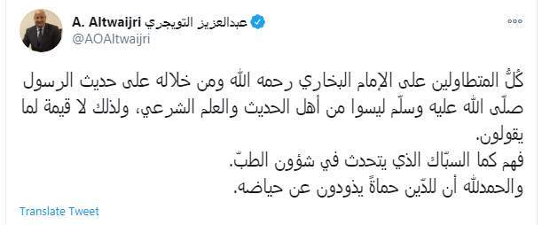وكتب عبد العزيز التويجري تغريدة على تويتر "كُلُّ المتطاولين على الإمام البخاري رحمه الله ومن خلاله على حديث الرسول صلّى الله عليه وسلّم ليسوا من أهل الحديث والعلم الشرعي، ولذلك لا قيمة لما يقولون. فهم كما السبّاك الذي يتحدث في شؤون الطبّ"