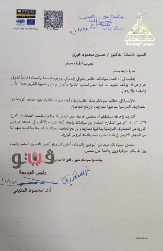 أصدر الدكتور محمود المتيني، رئيس جامعة عين شمس، قرار بإعفاء أبناء شهداء الأطباء جراء جائحة كورونا من المصروفات الدراسية.