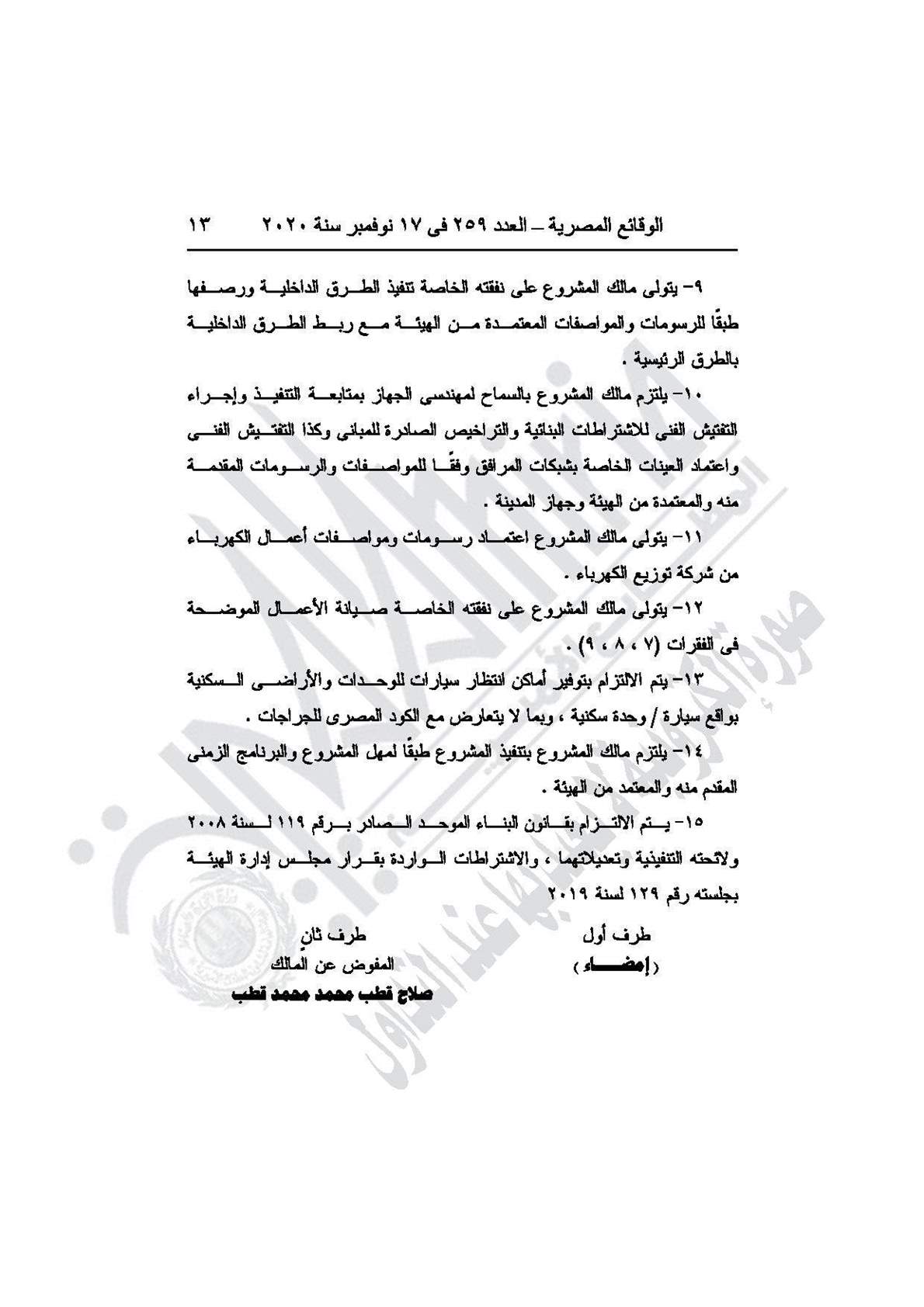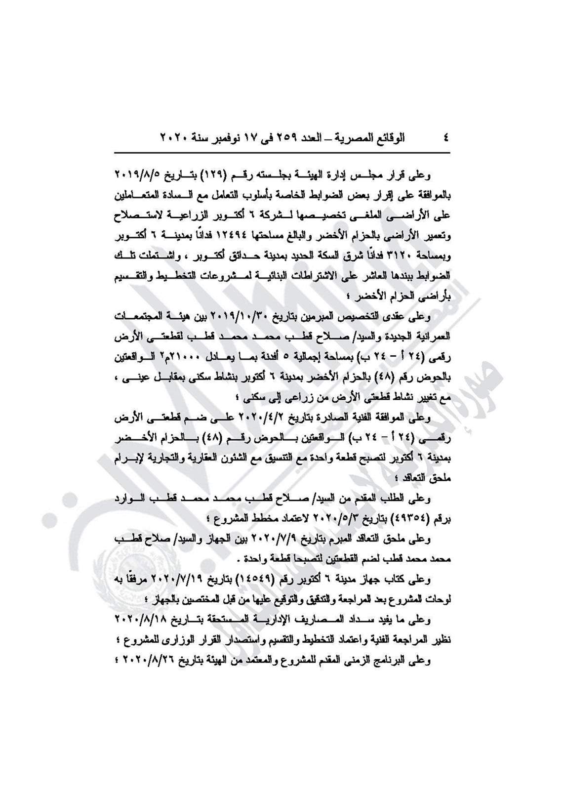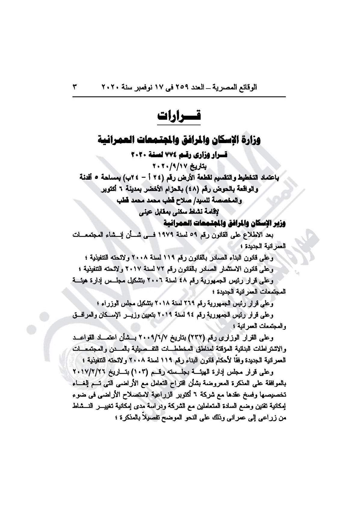نشرت جريدة الوقائع المصرية في عددها رقم 259، الصادر في 17 نوفمبر 2020، قرار وزارة الإسكان والمرافق والمجتمعات العمرانية رقم 774 لسنة 2020، باعتماد التخطيط والتقسيم لقطعة أرض بمساحة 5 أفدنة بالحزام الأخضر بمدينة 6 أكتوبر والمخصصة لصلاح قطب محمد محمد قطب لإقامة نشاط سكنى بمقابل عينى.