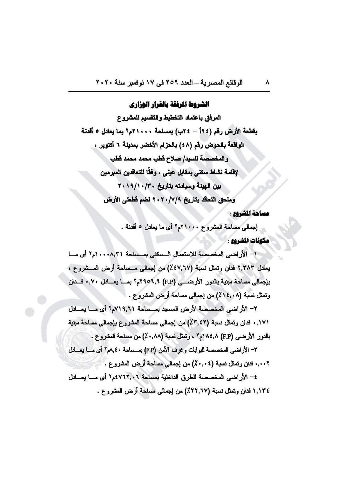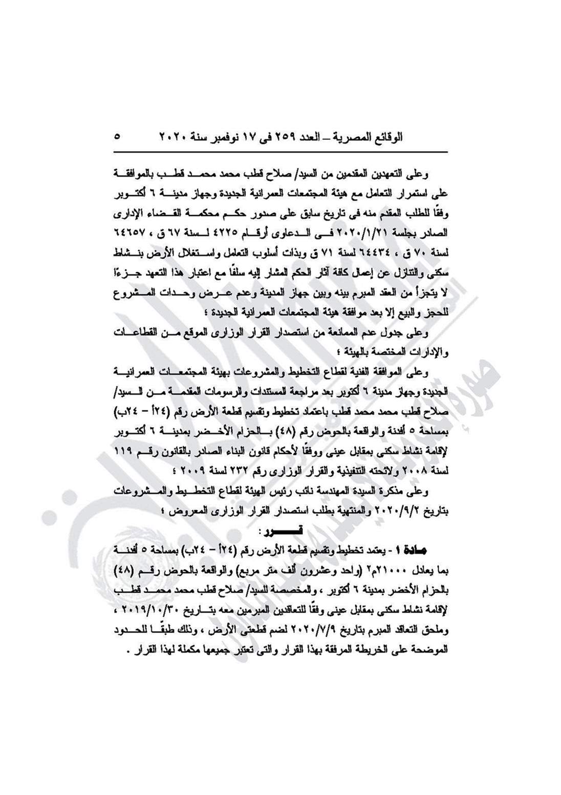 وينص القرار على اعتماد التخطيط والتقسيم لقطعة الأرض رقم (24 أ- 24ب) بمساحة 5 أفدنة والواقعة بالحوض رقم (48) بالحزام الأخضر بمدينة 6 أكتوبر والمخصصة لصلاح قطب محمد محمد قطب لإقامة نشاط سكني بمقابل عيني.