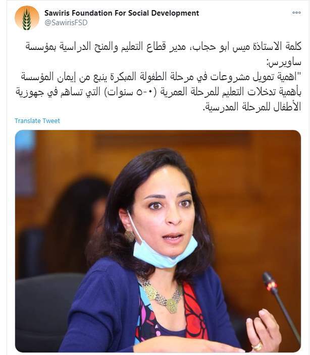 وكتبت مؤسسة ساويرس للتنمية الاجتماعية تغريدة لحديث المهندسة نورا سليم، المديرة التنفيذية لمؤسسة ساويرس للتنمية الاجتماعية على تويتر قالت فيها: "إن مرحلة الطفولة المبكرة هي الأهم في تشكيل وعي الطفل ونموه، وهو ما يتطلب تضافر الجهود بين جميع الجهات المعنية، ووضع البرامج وتنفيذ الخطط والمشاريع، من أجل النهوض ببرامج مرحلة الطفولة المبكرة.