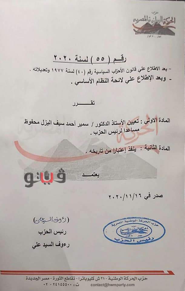 ونص القرار الذي حمل رقم 55 لسنة 2020 بتعيين الأستاذ الدكتور سمير أحمد سيف اليزل محفوظ محافظ بني سويف الأسبق مساعدا لرئيس الحزب.