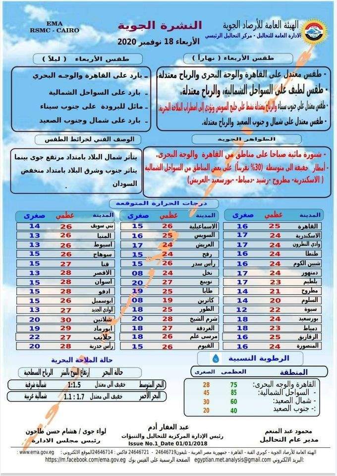 أعلنت هيئة الأرصاد الجوية حالة الطقس اليوم الأربعاء، وتوقعت أن يسود طقس معتدل على أغلب البلاد، لطيف على السواحل الغربية، مائل للحرارة على جنوب الصعيد.