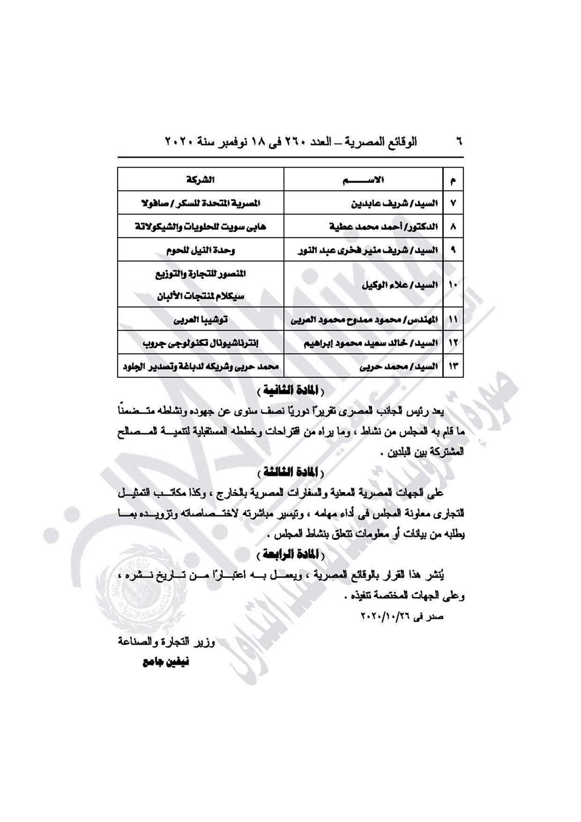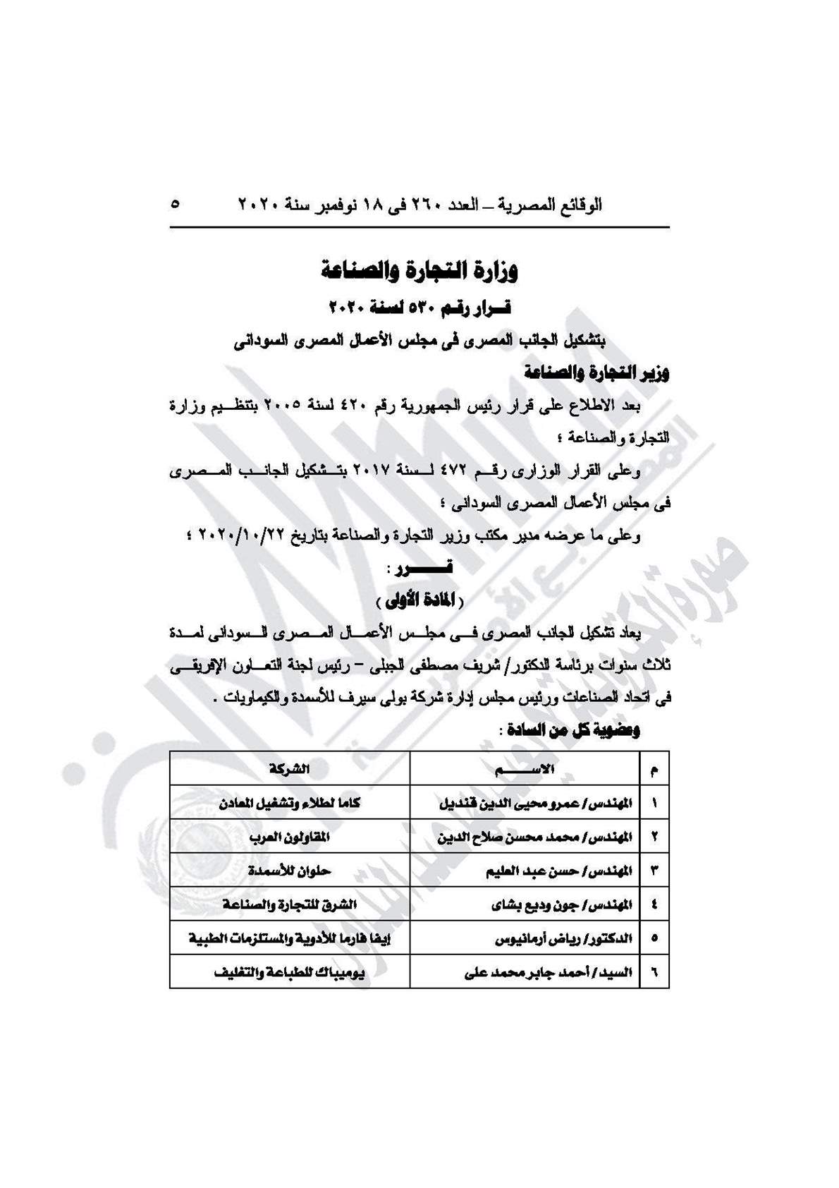 نشرت جريدة الوقائع المصرية في عددها رقم 260، الصادر في 18 نوفمبر 2020، قرار وزارة التجارة والصناعة رقم 530 لسنة 2020، بتشكيل الجانب المصرى فى مجلس الأعمال المصرى السودانى.