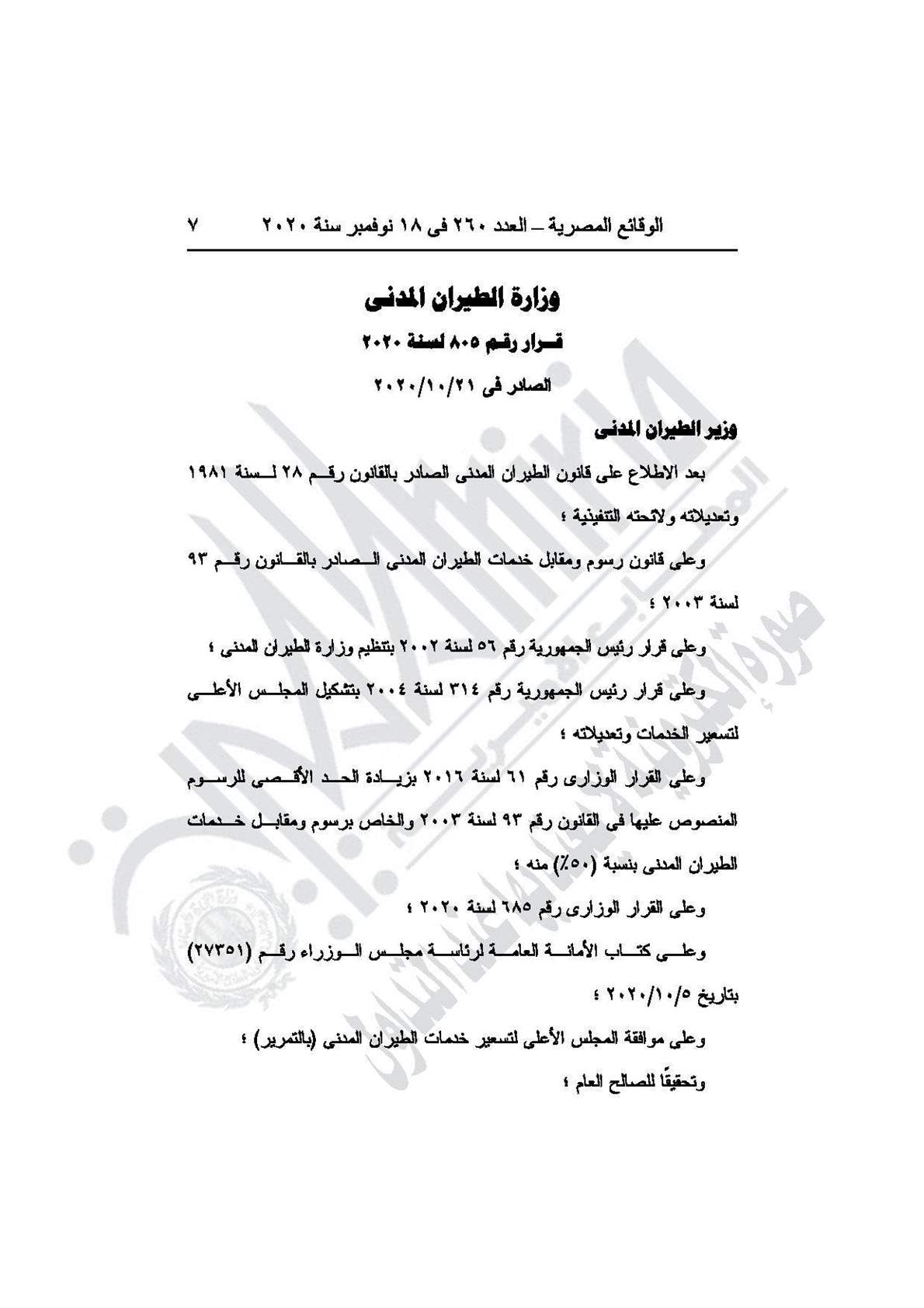 نشرت جريدة الوقائع المصرية في عددها رقم 260، الصادر في 18 نوفمبر 2020، قرار وزارة الطيران المدني رقم 805 لسنة 2020، بشأن منح شركات الطيران العاملة بالمطارات فى 5 محافظات تخفيض قدره (50٪) على رسوم الهبوط والانتظار والإيواء و(20٪) مقابل الخدمات الأرضية المقدمة لطائراتها لمدة 6 أشهر.
