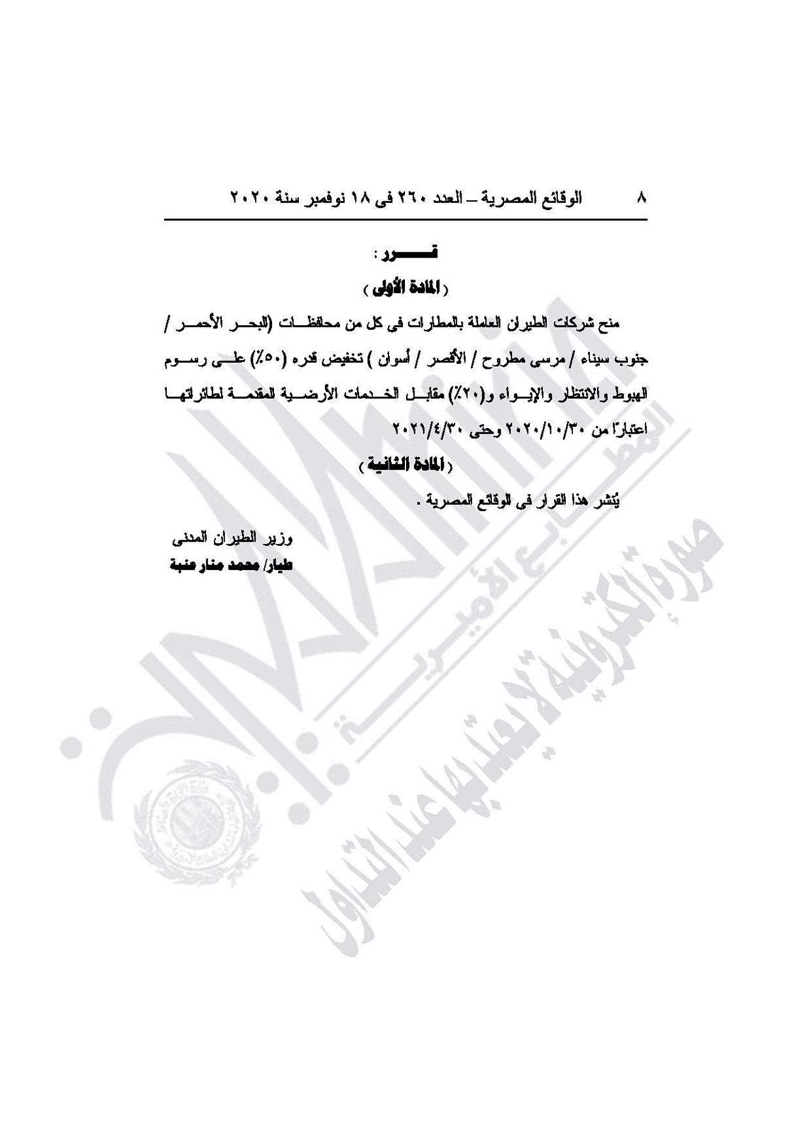 وينص القرار على منح شركات الطيران العاملة بالمطارات فى كل من محافظات (البحر الأحمر، وجنوب سيناء، ومرسى مطروح، والأقصر، وأسوان ) تخفيض قدره (50٪) على رسوم الهبوط والانتظار والإيواء و(20٪) مقابل الخدمات الأرضية المقدمة لطائراتها اعتبارًا من 30/10/2020 وحتى 30/4/2021