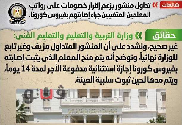 وتواصل المركز الإعلامي لمجلس الوزراء مع وزارة التربية والتعليم والتعليم الفني، والتي نفت تلك الأنباء، مُؤكدة أنه لا صحة لإقرار أي خصومات على رواتب المعلمين المتغيبين جراء إصابتهم بفيروس كورونا، مُشددةً على أن المنشور المتداول مزيف وغير تابع للوزارة نهائياً، مُوضحةً أنه يتم منح المعلم الذي يثبت إصابته بفيروس كورونا إجازة استثنائية مدفوعة الأجر لمدة 14 يوماً، ويتم مدها لحين ثبوت سلبية العينة.