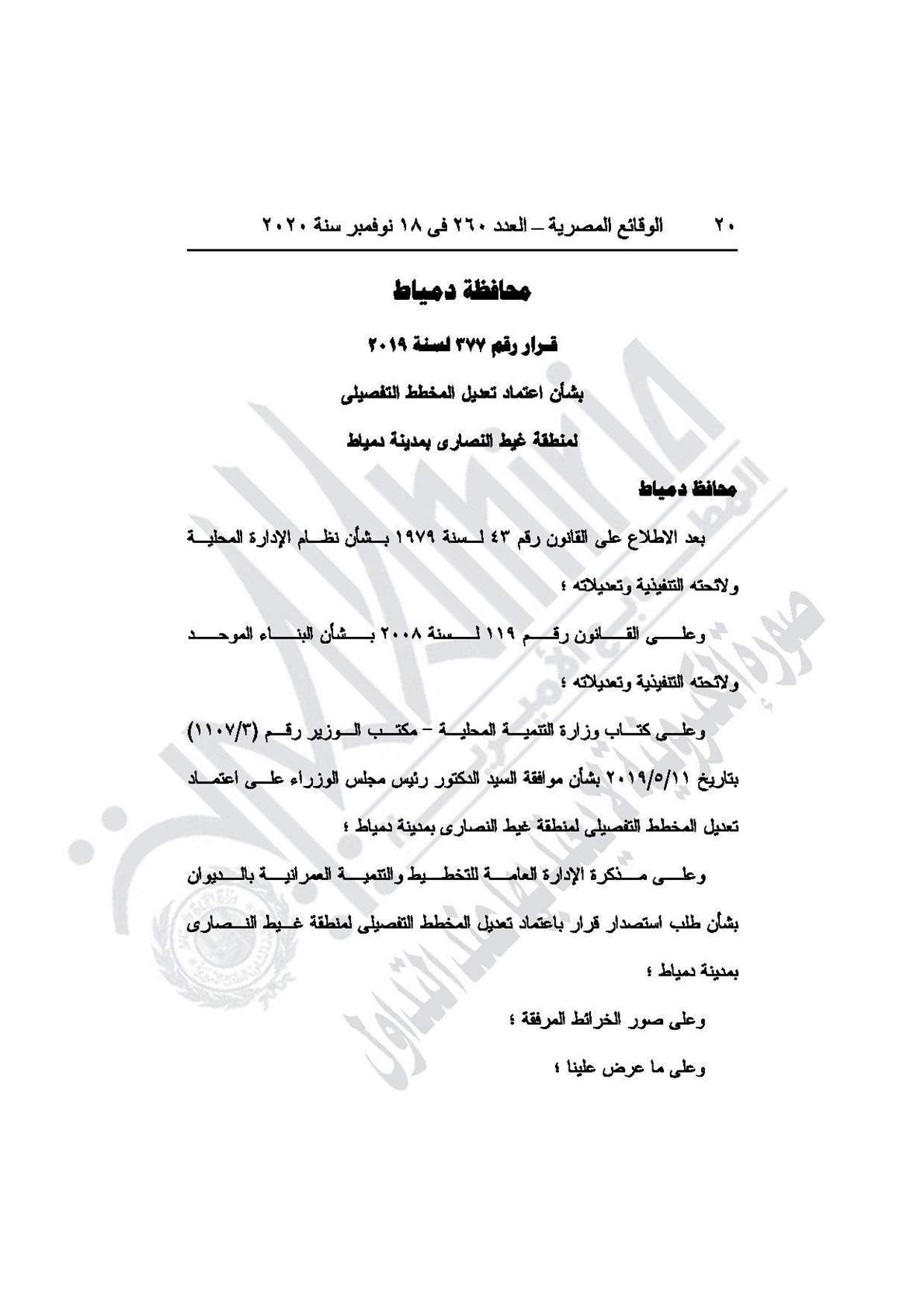 القرار رقم 377 لسنة 2019، بشأن اعتماد تعديل المخطط التفصيلي لمنطقة غيط النصارى بمدينة دمياط.