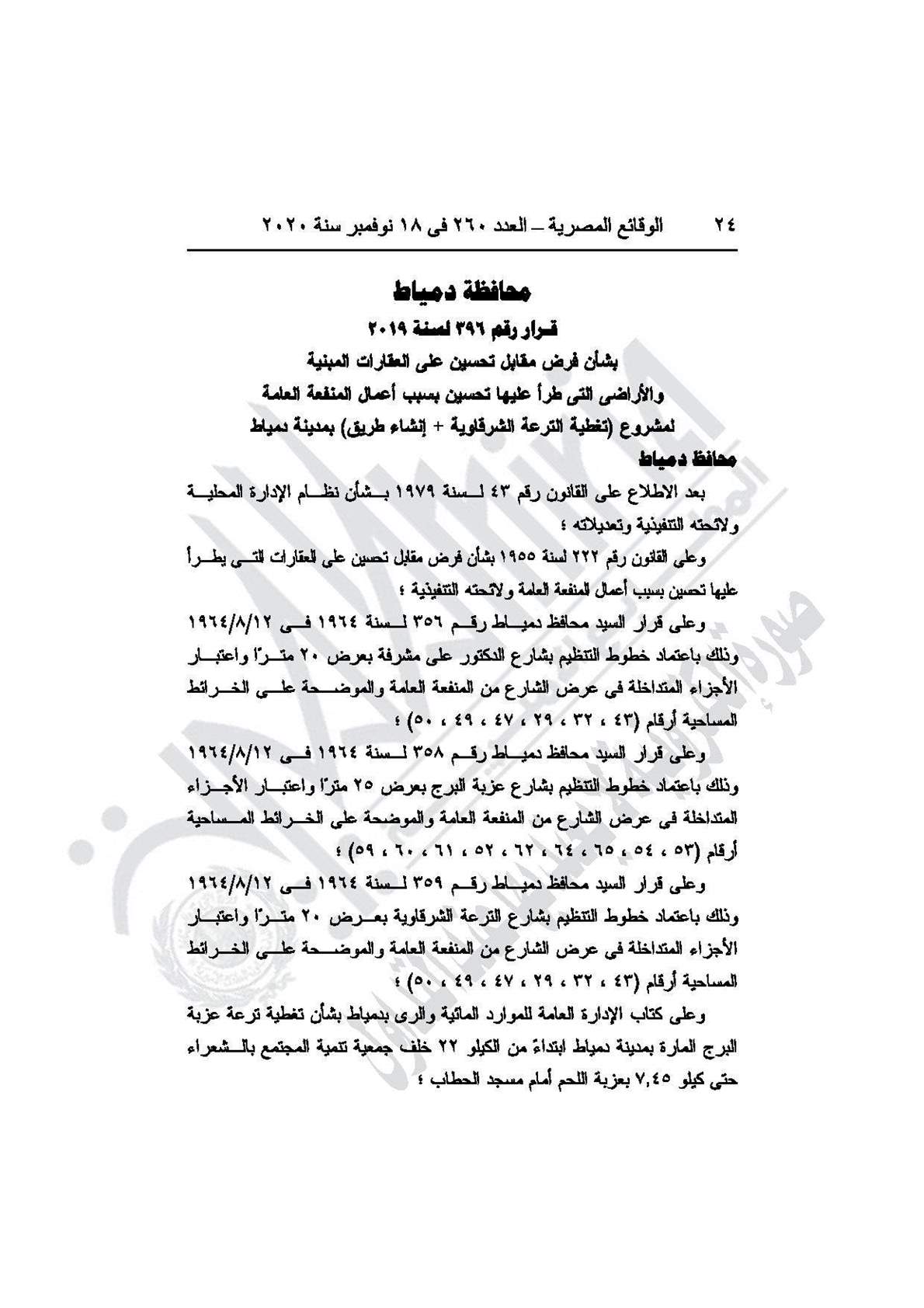 والقرار رقم 396 لسنة 2019، بشأن فرض مقابل تحسين على العقارات المبنية والأراضى التى طرأ عليها تحسين بسبب أعمال المنفعة العامة لمشروع (تغطية الترعة الشرقاوية+ إنشاء طريق) بمدينة دمياط.