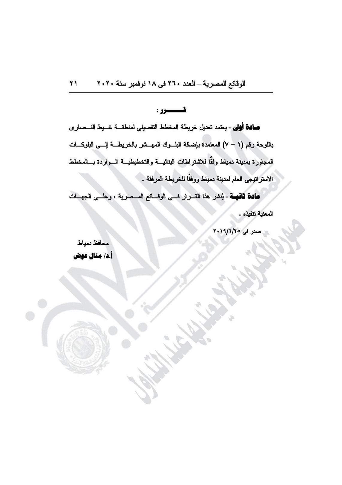 نشرت جريدة الوقائع المصرية في عددها رقم 260، الصادر في 18 نوفمبر 2020، قرارا محافظة دمياط بشأن اعتماد تعديل المخطط التفصيلى لمنطقة غيط النصارى بمدينة دمياط، و فرض مقابل تحسين على العقارات المبنية والأراضى التى طرأ عليها تحسين بسبب أعمال المنفعة العامة.