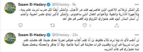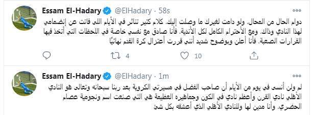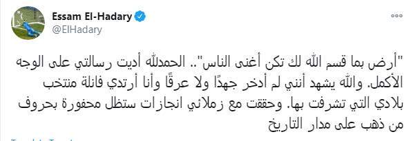 وكتب عصام الحضري تغريدة على تويتر "أرض بما قسم الله لك تكن أغنى الناس".. الحمدلله أديت رسالتي على الوجه الأكمل. والله يشهد أنني لم أدخر جهدًا ولا عرقًا وأنا أرتدي فانلة منتخب بلادي التي تشرفت بها. وحققت مع زملائي انجازات ستظل محفورة بحروف من ذهب على مدار التاريخ"
