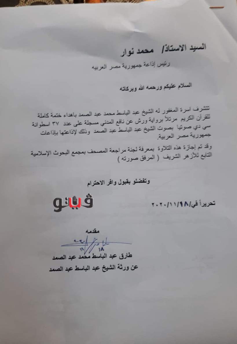 تضمنت أخبار ماسبيرو مرور ٣٢ عاما على وفاة الشيخ عبد الباسط عبد الصمد والذي يحل في الثلاثين من الشهر الجاري ذكرى وفاته وبهذه المناسبة أهدت أسرة الشيخ الراحل ممثلة في نجله اللواء طارق عبد الباسط عبد الصمد اليوم القرآن الكريم كاملا ومسجلا برواية ورش عن نافع إلى الإذاعة المصرية حيث تسلم التلاوات رئيس الإذاعة محمد نوار.