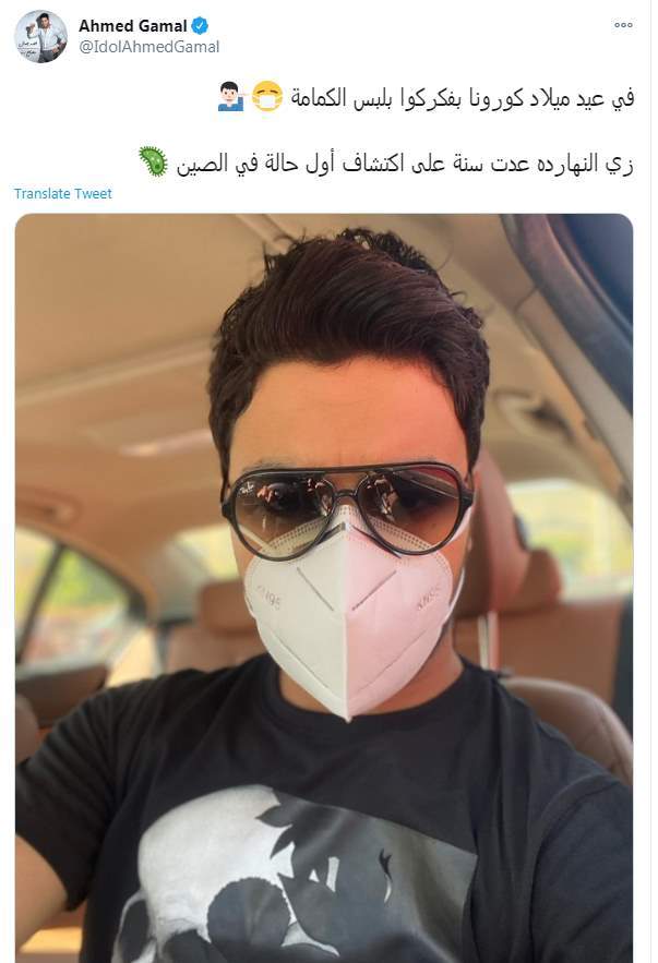وكتب أحمد جمال تغريدة على تويتر "في عيد ميلاد كورونا بفكركوا بلبس الكمامة.. زي النهارده عدت سنة على اكتشاف أول حالة في الصين"