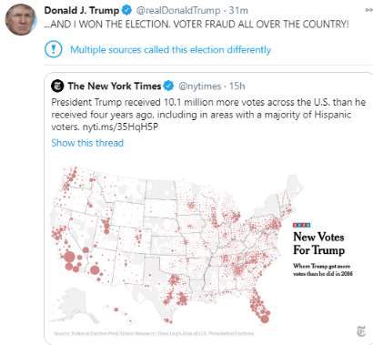 وعلق ترامب على الخريطة، قائلا: "فزت في الانتخابات.. إنه احتيال على الناخبين في جميع أنحاء البلاد".