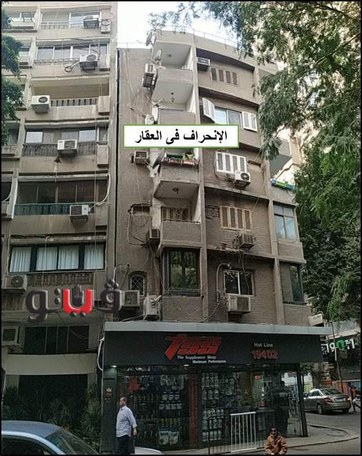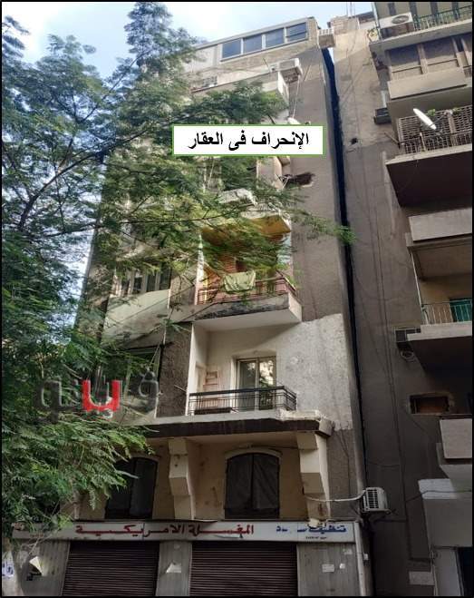 أ. العقار رقم ( 5 ، 7 ) به ميل 19 سم وهو مكون من (دور أرضي + ميزانين + 6 أدوار متكررة ) ويوجد رخصة للدور الثالث والرابع متكرر فقط ، ولا يوجد رخصة لتعلية الدورين الخامس والسادس ولم يستدل على الرخصة الأصلية للعقار ، وصادر له قرار تنكيس رقم 3 لعام 1995من محافظة القاهرة.