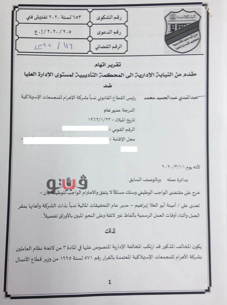 قررت وزارة العدل في القضية رقم 116 لسنة 62 قضائية عليا إحالة رئيس القطاع القانوني ندبًا بشركة الأهرام للمجمعات الاستهلاكية بتهمة الاعتداء على مدير عام التحقيقات المالية ندبًا بذات الشركة وإهانتها.