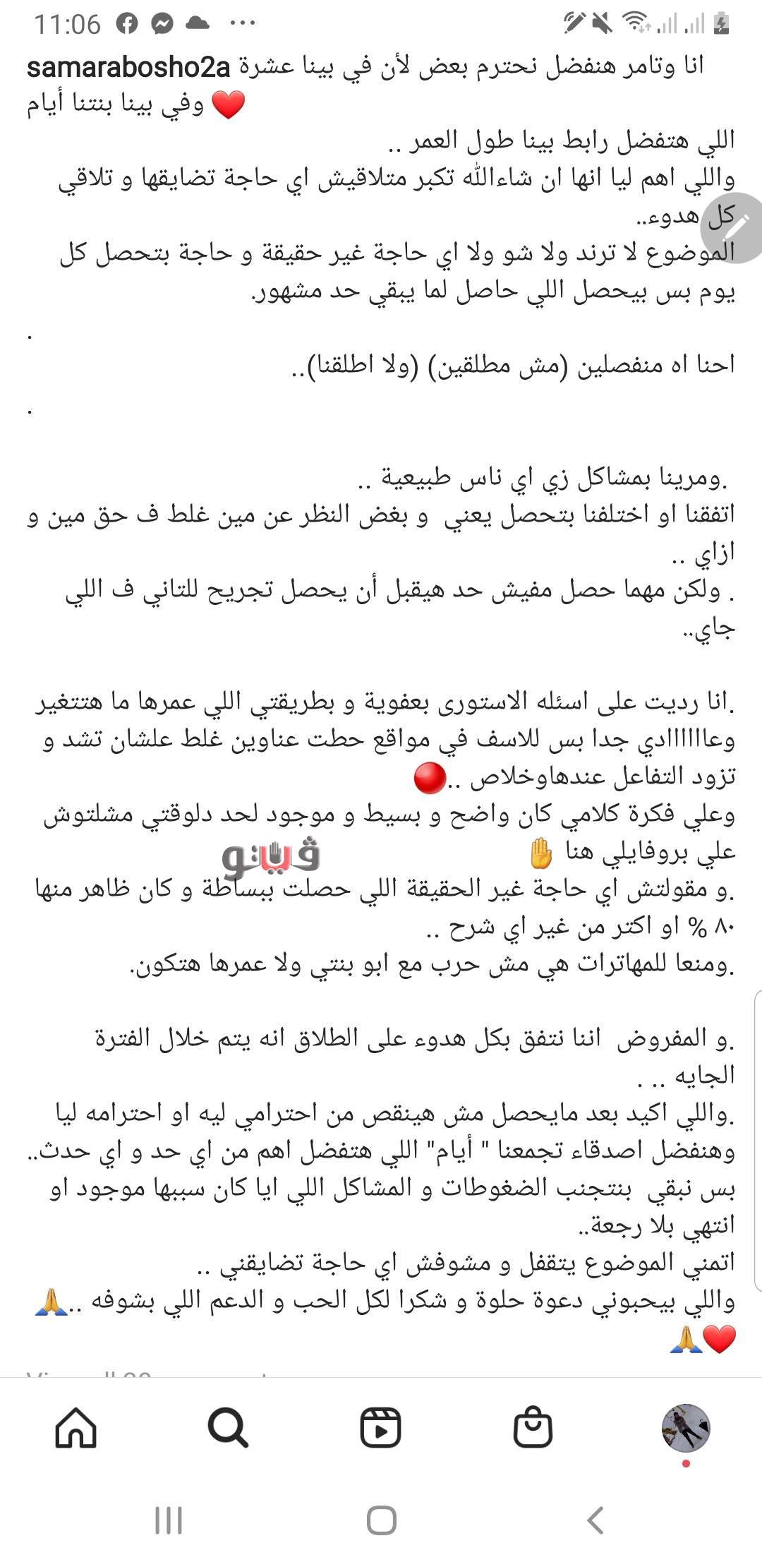 واستطردت: "ومنعا للمهاترات هي مش حرب مع ابو بنتي ولا عمرها هتكون.و المفروض اننا نتفق بكل هدوء على الطلاق انه يتم خلال الفترة الجايه، واللي اكيد بعد مايحصل مش هينقص من احترامي ليه او احترامه ليا وهنفضل اصدقاء تجمعنا " أيام" اللي هتفضل اهم من اي حد و اي حدث، بس نبقي بنتجنب الضغوطات و المشاكل اللي ايا كان سببها موجود او انتهي بلا رجعة و اتمني الموضوع يتقفل و مشوفش اي حاجة تضايقني واللي بيحبوني دعوة حلوة و شكرا لكل الحب و الدعم اللي بشوفه".