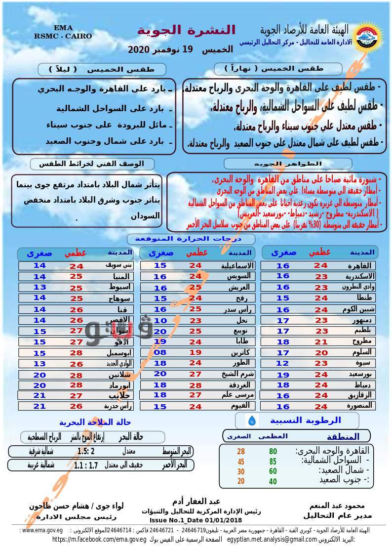 وفيما يلى بيان بدرجات الحرارة المتوقعة اليوم على مدن ومحافظات مصر..