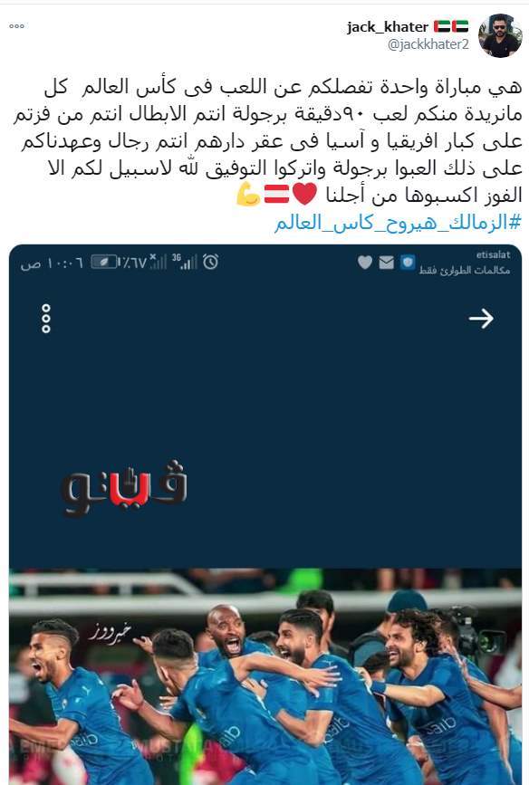 وكتب جاك خاطر: "هي مباراة واحدة تفصلكم عن اللعب في كأس العالم.. كل ما نريده منكم لعب ٩٠ دقيقة برجولة أنتم الأبطال أنتم من فزتم على كبار أفريقيا وآسيا فى عقر دارهم أنتم رجال عهدناكم على ذلك العبوا برجولة واتركوا التوفيق لله لا سبيل لكم إلا الفوز اكسبوها من أجلنا".