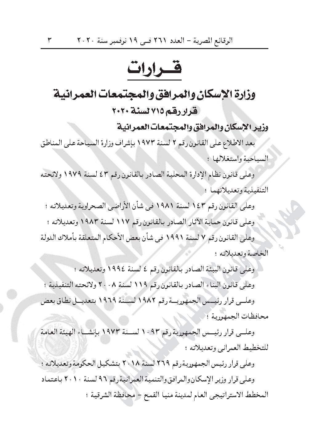 القرار رقم 715 لسنة 2020، باعتماد تعديل المخطط الاستراتيجي العام لمدينة منيا القمح محافظة الشرقية، وفقًا للاشتراطات التخطيطية والبنائية الواردة بموافقة هيئة عمليات القوات المسلحة.