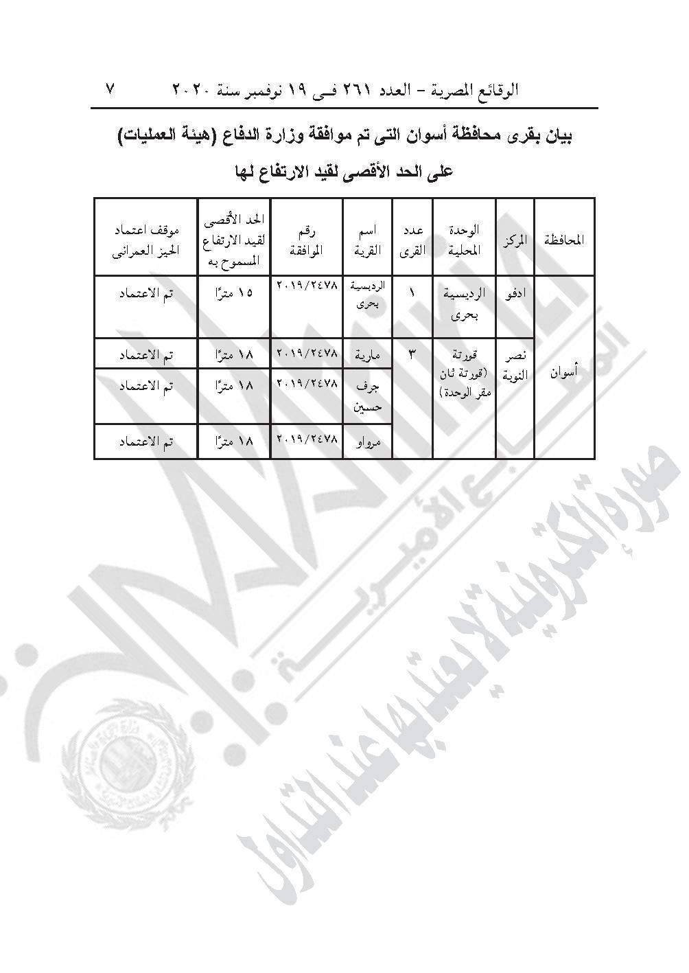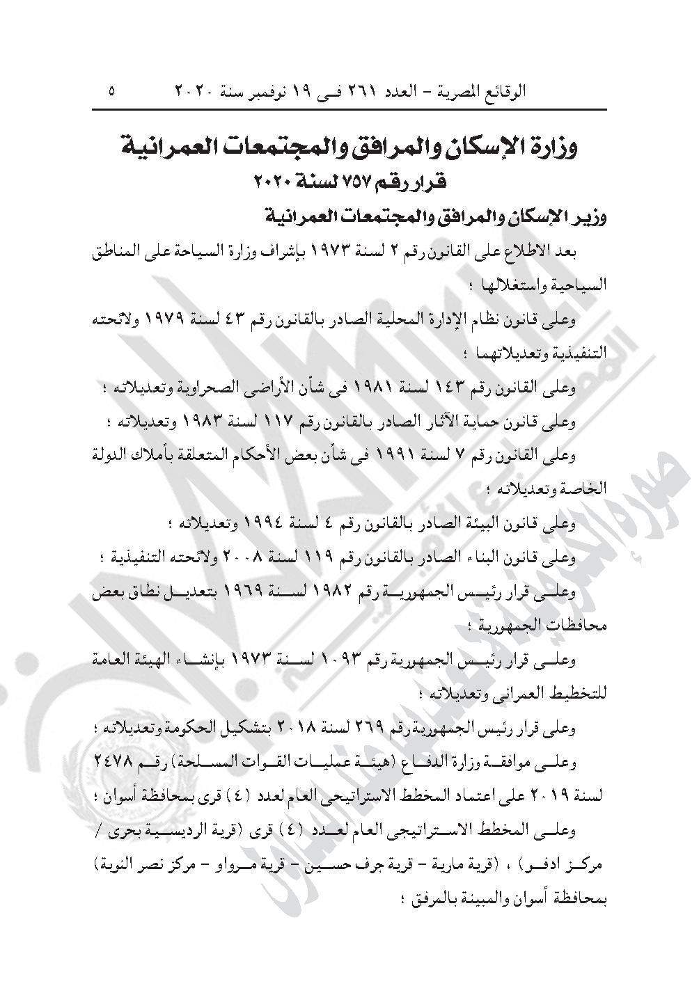 والقرار رقم 757 لسنة 2020، باعتماد المخطط الاستراتيجي العام لـ4 قرى (قرية الرديسية بحري مركز أدفو، قرية مارية وقرية جرف حسين وقرية مرواو مركز نصر النوبة)، بمحافظة أسوان طبقًا للاشتراطات التخطيطية والبنائية مع مراعاة الحد الأقصى للارتفاعات الواردة بموافقة هيئة عمليات القوات المسلحة.