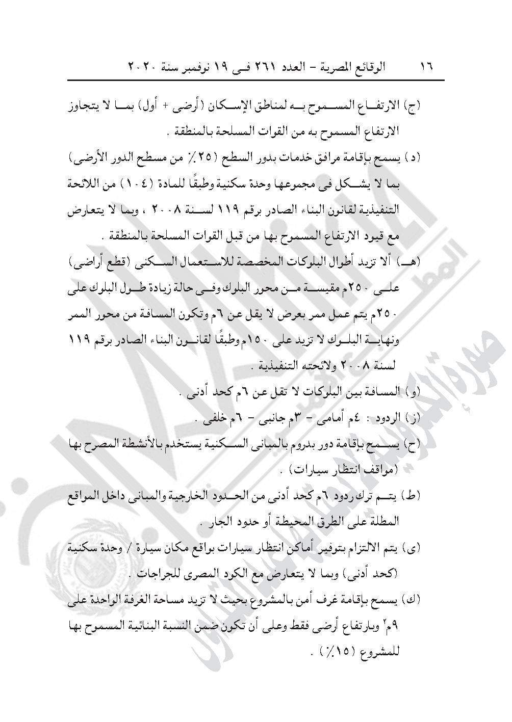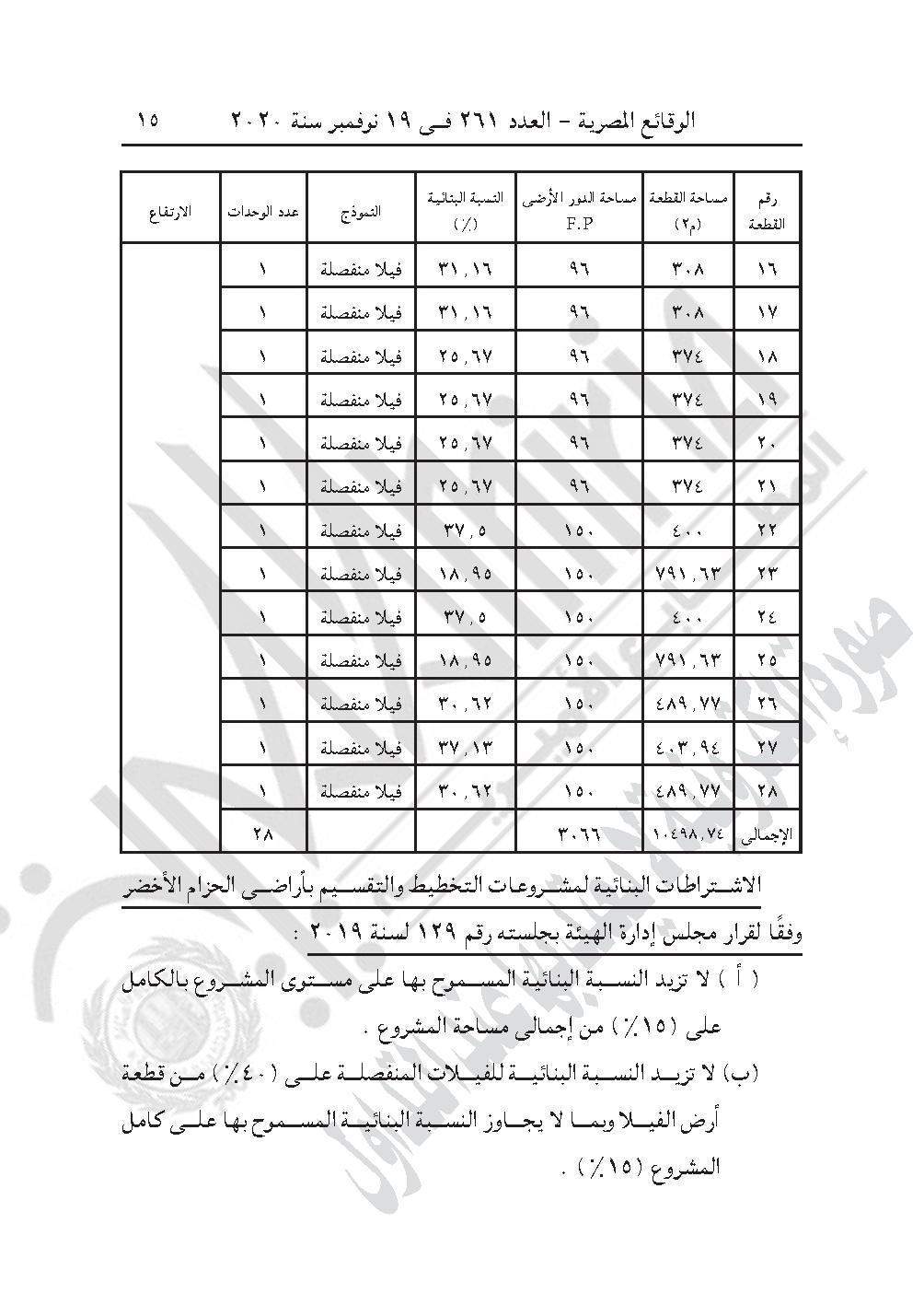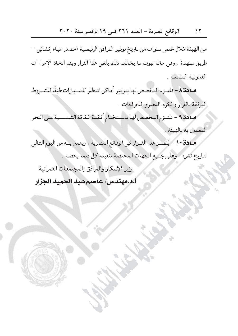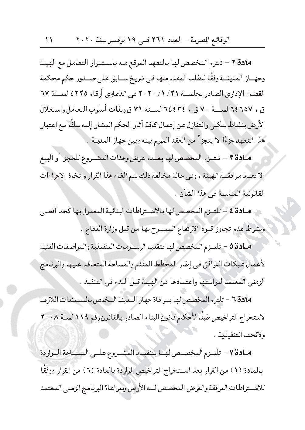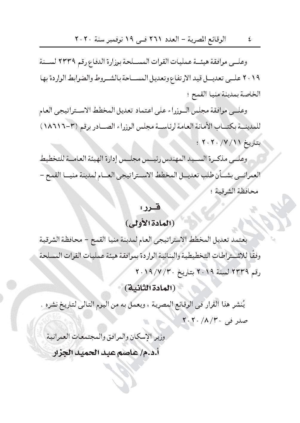 نشرت جريدة الوقائع المصرية في عددها رقم 261، الصادر في 19 نوفمبر 2020، 3 قرارات لوزارة الإسكان والمرافق والمجتمعات العمرانية، باعتماد تعديل المخطط الاستراتيجي العام لمدينة منيا القمح محافظة الشرقية، المخطط الاستراتيجي العام لـ4 قرى (قرية الرديسية بحري مركز أدفو، قرية مارية وقرية جرف حسين وقرية مرواو مركز نصر النوبة) بمحافظة أسوان، واعتماد تخطيط وتقسيم قطعة الأرض بالحزام الأخضر بمدينة 6 أكتوبر لإقامة مشروع سكني بمقابل عيني.