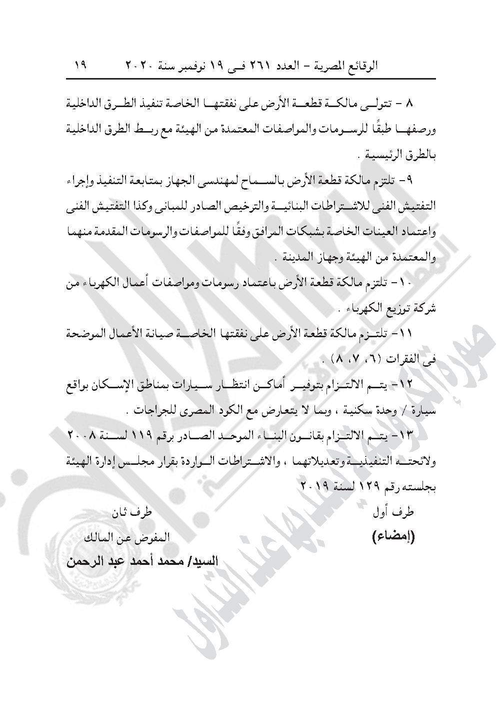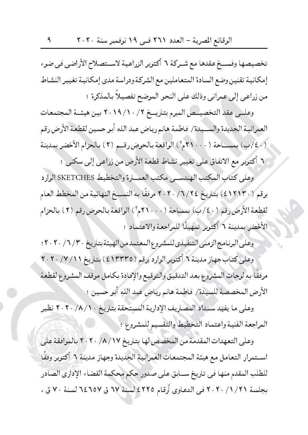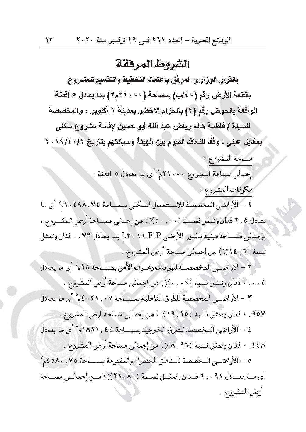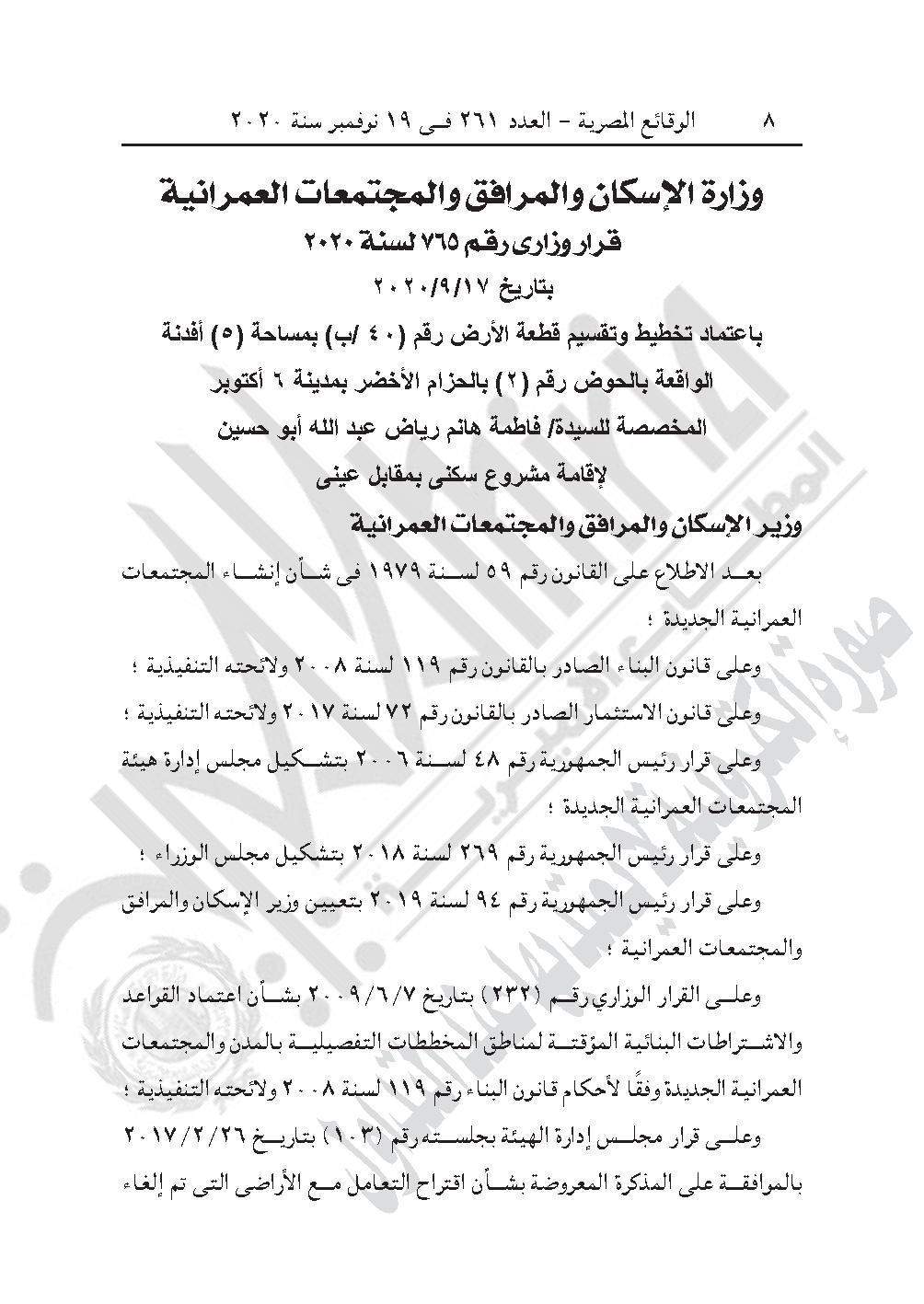 والقرار رقم 765 لسنة 2020، باعتماد تخطيط وتقسيم قطعة الأرض رقم 40/ب بمساحة 5 أفدنة الواقعة بالحوض رقم 2 بالحزام الأخضر بمدينة 6 أكتوبر المخصصة لـفاطمة هانم رياض عبد الله أبو حسين، لإقامة مشروع سكني بمقابل عيني.