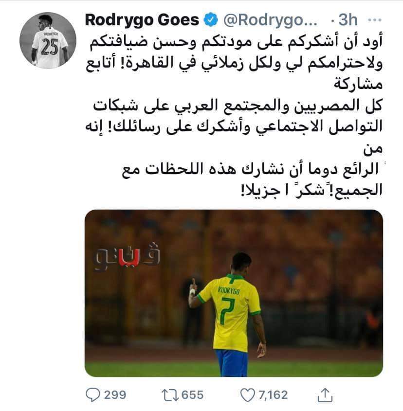 وجه رودريجو نجم ريال مدريد والمنتخب الأوليمبي البرازيلي رسالة للجماهير المصرية بعد نهاية زيارته للقاهرة مع المنتخب للمشاركة فى البطولة الدولية الودية.