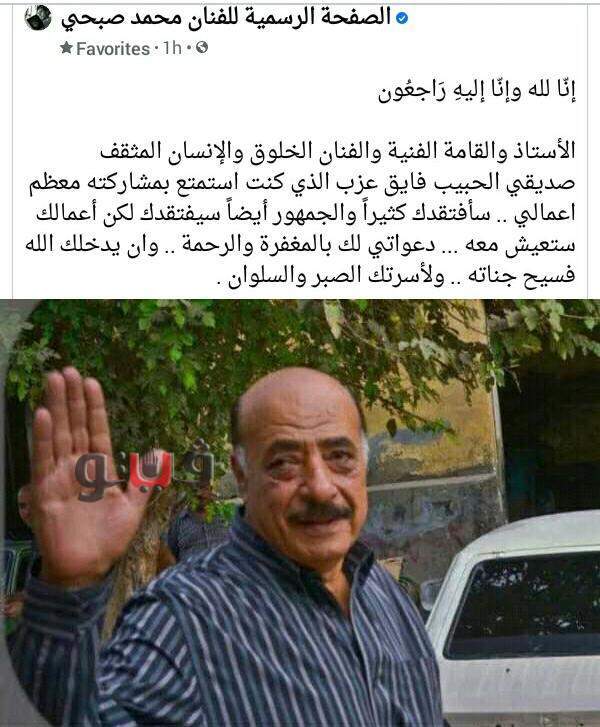نعى الفنان محمد صبحي، الفنان فايق عزب، الذي وافته المنية صباح اليوم الخميس، بعد صراع طويل مع المرض، عن عمر يناهز الـ 77 عاماً.