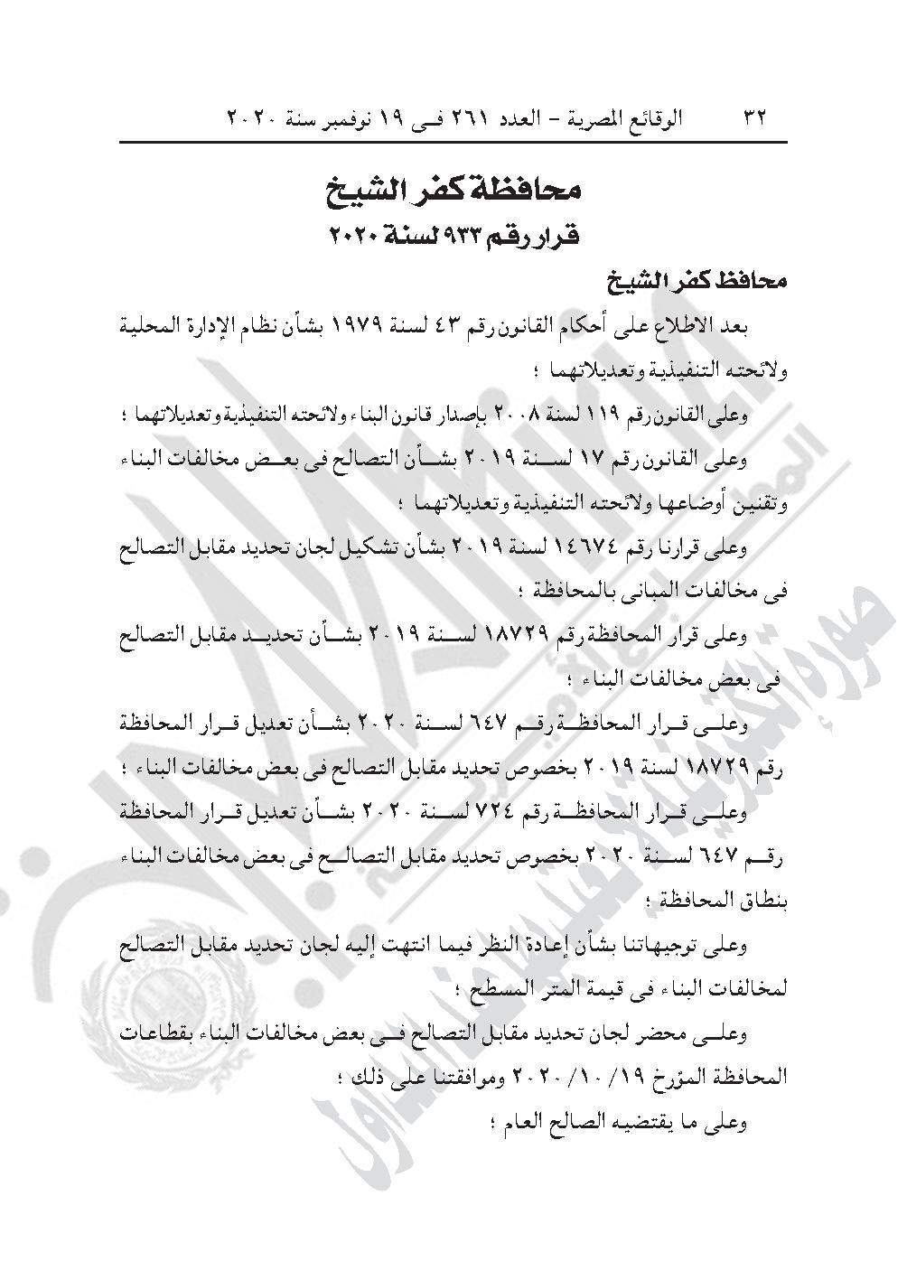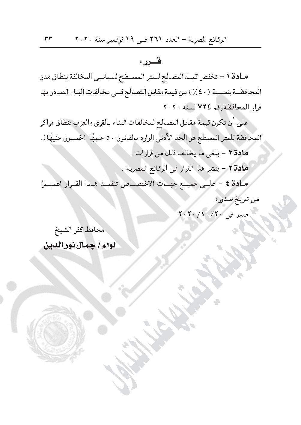 نشرت جريدة الوقائع المصرية في عددها رقم 261، الصادر في 19 نوفمبر 2020، قرار محافظة كفر الشيخ 933 لسنة 2020، بشأن تخفيض قيمة التصالح للمتر المسطح للمباني المخالفة بنطاق مدن المحافظة بنسبة (40٪) من قيمة مقابل التصالح فى مخالفات البناء.