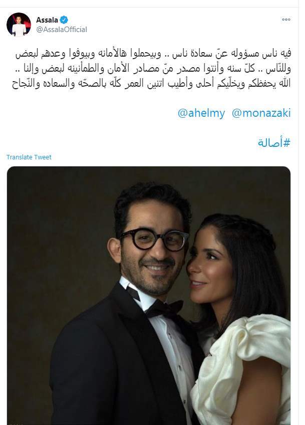 وكتبت أصالة تغريدة على تويتر "فيه ناس مسئولة عنّ سعادة ناس.. وبيحملوا هالأمانة وبيوفوا وعدهم لبعض وللنّاس.. كلّ سنه وأنتوا مصدر منّ مصادر الأمان والطمأنينة لبعض وإلنا.. الله يحفظكم ويخلّيكم أحلى وأطيب اتنين العمر كلّه بالصحّه والسعاده والنّجاح.. @monazaki.. @ahelmy"