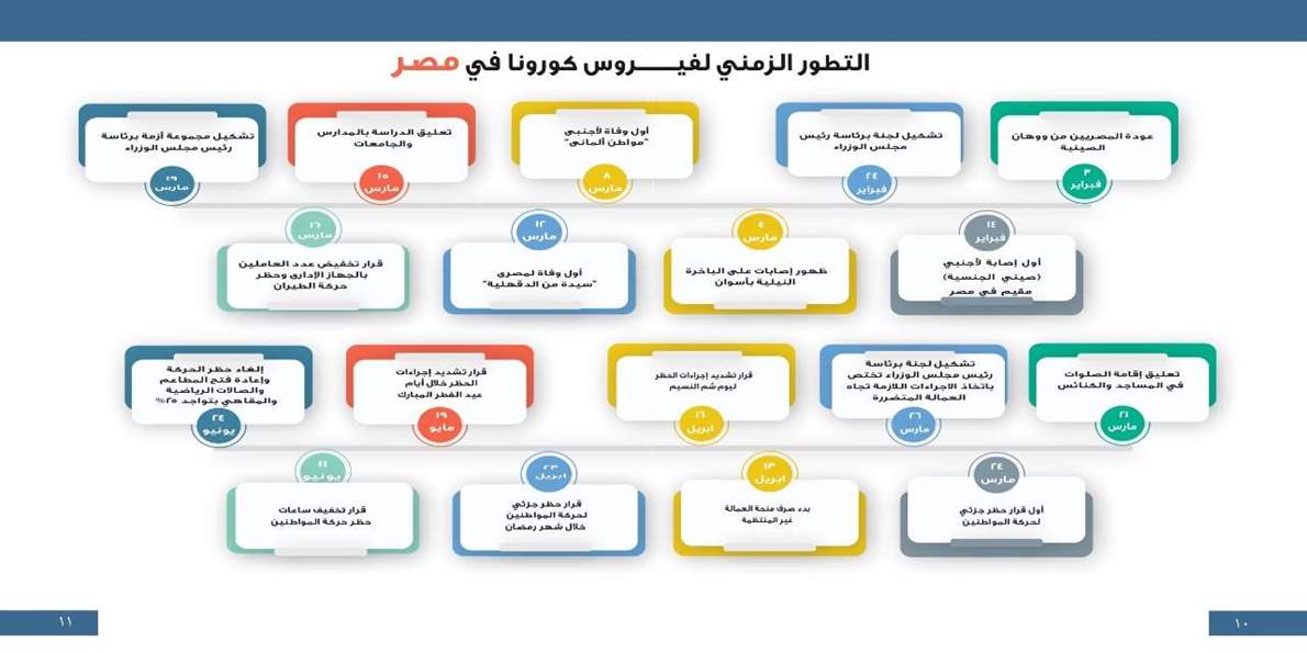 وأشار التقرير إلى أنه تم، في ضوء ذلك، العمل على 6 محاور تمثلت في تطبيق الإجراءات الوقائية، وحظر حركة المواطنين والحد من التجمعات، وتعزيز البنية التحتية الطبية، وتوفير المستلزمات والسلع الاستراتيجية، والحد من تداعيات "كورونا" على المواطن والاقتصاد المصري، وعودة المصريين العالقين في الخارج، والتوعية الإعلامية ومواجهة الشائعات.