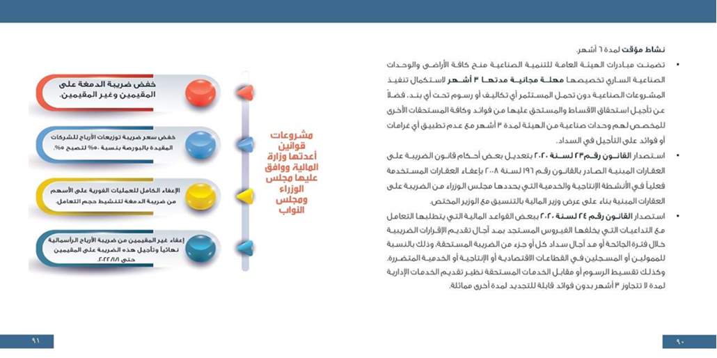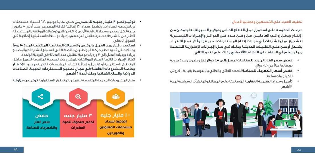 كما حرصت الحكومة على تخفيف العبء عن المُصنعين ومجتمع الأعمال، حيث تم تخصيص 10 مليارات جنيه إضافية لسداد مستحقات المقاولين والموردين، وتم تدبير 3 مليارات جنيه إضافية لسداد مستحقات برنامج دعم الصادرات، كما تم خفض سعر الغاز والكهرباء للصناعة، وتأجيل سداد الضريبة العقارية على المصانع لمدة 3 أشهر.