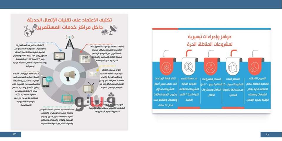 وأضاف التقرير أنه تم التصريح للشركات الصناعية، العاملة بنظام المناطق الحرة، بإنتاج الكمامات ومهمات الوقاية بمجرد الإخطار، وتم السماح لهذه المشروعات ببيع ٥٠٪ من منتجاتها بالسوق المحلي، واتخاذ كافة الإجراءات التي تضمن تسيير أعمال المشروعات لدخول وخروج الأجهزة والآلات والمعدات والبضائع على مدار ٢٤ ساعة، لافتا إلى أنه تم تكثيف الاعتماد على تقنيات الاتصال الحديثة داخل مراكز خدمات المستثمرين.