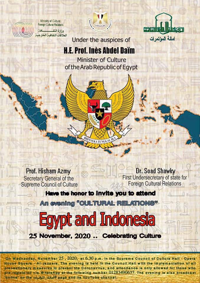 ينظم قطاع العلاقات الثقافية الخارجية، برئاسة الدكتورة سعاد شوقي، بالتعاون مع المجلس الأعلى للثقافة، في تمام السادسة والنصف مساءً، مساء يوم الأربعاء المقبل، أمسية ثقافية بعنوان "مصر وإندونيسيا - علاقات ثقافية".