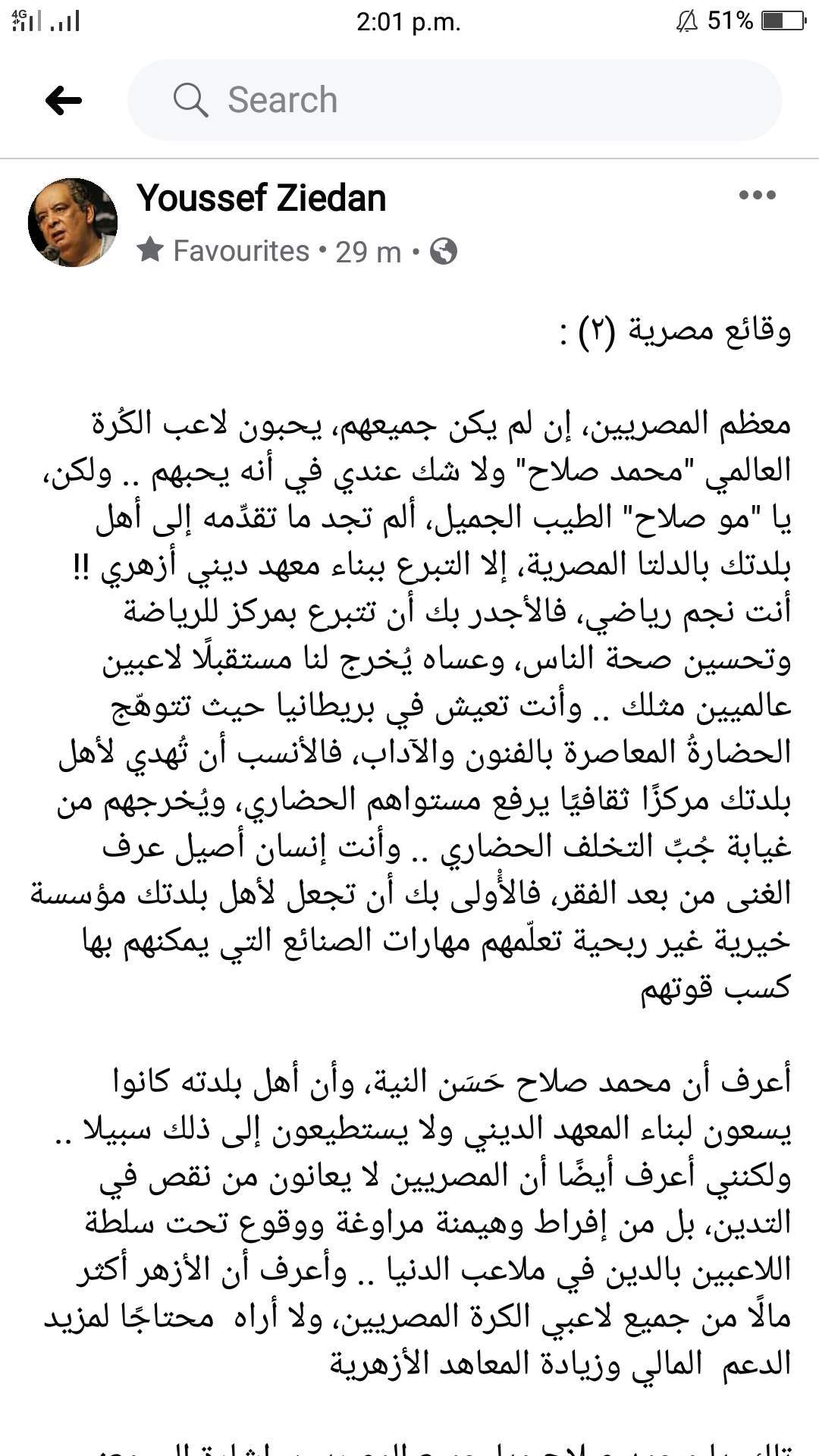 وأضاف: "أعرف أن محمد صلاح حَسَن النية، وأن أهل بلدته كانوا يسعون لبناء المعهد الديني ولا يستطيعون إلى ذلك سبيلا .. ولكنني أعرف أيضًا أن المصريين لا يعانون من نقص في التدين، بل من إفراط وهيمنة مراوغة ووقوع تحت سلطة اللاعبين بالدين في ملاعب الدنيا .. وأعرف أن الأزهر أكثر مالًا من جميع لاعبي الكرة المصريين، ولا أراه محتاجًا لمزيد الدعم المالي وزيادة المعاهد الأزهرية".
