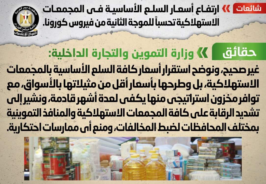 وقام المركز الإعلامي لمجلس الوزراء بالتواصل مع وزارة التموين والتجارة الداخلية، والتي نفت تلك الأنباء، مُؤكدةً أنه لا صحة لارتفاع أسعار أي من السلع الأساسية في المجمعات الاستهلاكية، مُوضحةً استقرار أسعار كافة السلع الأساسية بالمجمعات الاستهلاكية، بل وطرحها بأسعار أقل من مثيلاتها بالأسواق، مع توافر مخزون استراتيجي منها يكفي لعدة أشهر قادمة، مُشيرةً إلى تشديد الرقابة على كافة المجمعات الاستهلاكية والمنافذ التموينية بمختلف المحافظات لضبط المخالفات، ومنع أي ممارسات احتكارية.