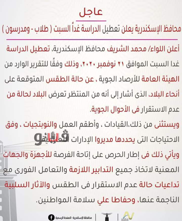 أعلن اللواء محمد الشريف محافظ الإسكندرية، أنه تقرر تعطيل العمل غدا السبت بجميع المرافق الحكومية عدا مرافق المياه والصرف الصحي والإسعاف والكهرباء وغيرها من المرافق الضرورية.