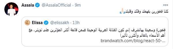 وذلك تعليقًا على تغريدة الفنانة إليسا التي قالت فيها "فخورة وسعيدة بهالشرف إني أكون الفنانة العربية الوحيدة ضمن قائمة أكتر المؤثرين على تويتر، مع أهم الأسماء بالعالم وأكثرهن تأثيرا"